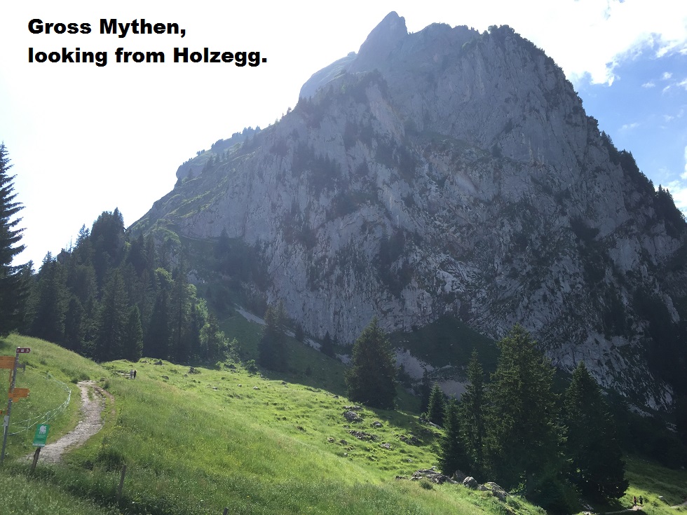 In my last posting here, I mentioned going to the Raffeisen Skywalk at Mostelberg last weekend. Well, the bridge was not the only reason for my going there. I had decided to walk from Mostelberg to Rotenflue, taking in the mountain called Mythen. Mythen is a massive rocky peak in the canton of Schwyz. It is not particularly high, but it is well separated from other mountains, so it offers commanding views of the surrounding countryside.