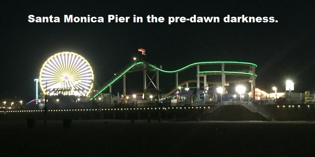But last week was not so bad. I was in Santa Monica, a township on the coast of California, within the commuter belt of Los Angeles. Now, in a previous posting, I mentioned the psychological importance of walking in the morning, to build up the step count early in the day. So while I was in Santa Monica, I rose early each morning and walked down to the beach. There is a promenade area that separates the beach from the nearest buildings, and that was my place for walking. Five o’clock each morning would see me walking the promenade, starting in the pre-dawn, and usually getting back to my hotel shortly after sun-up