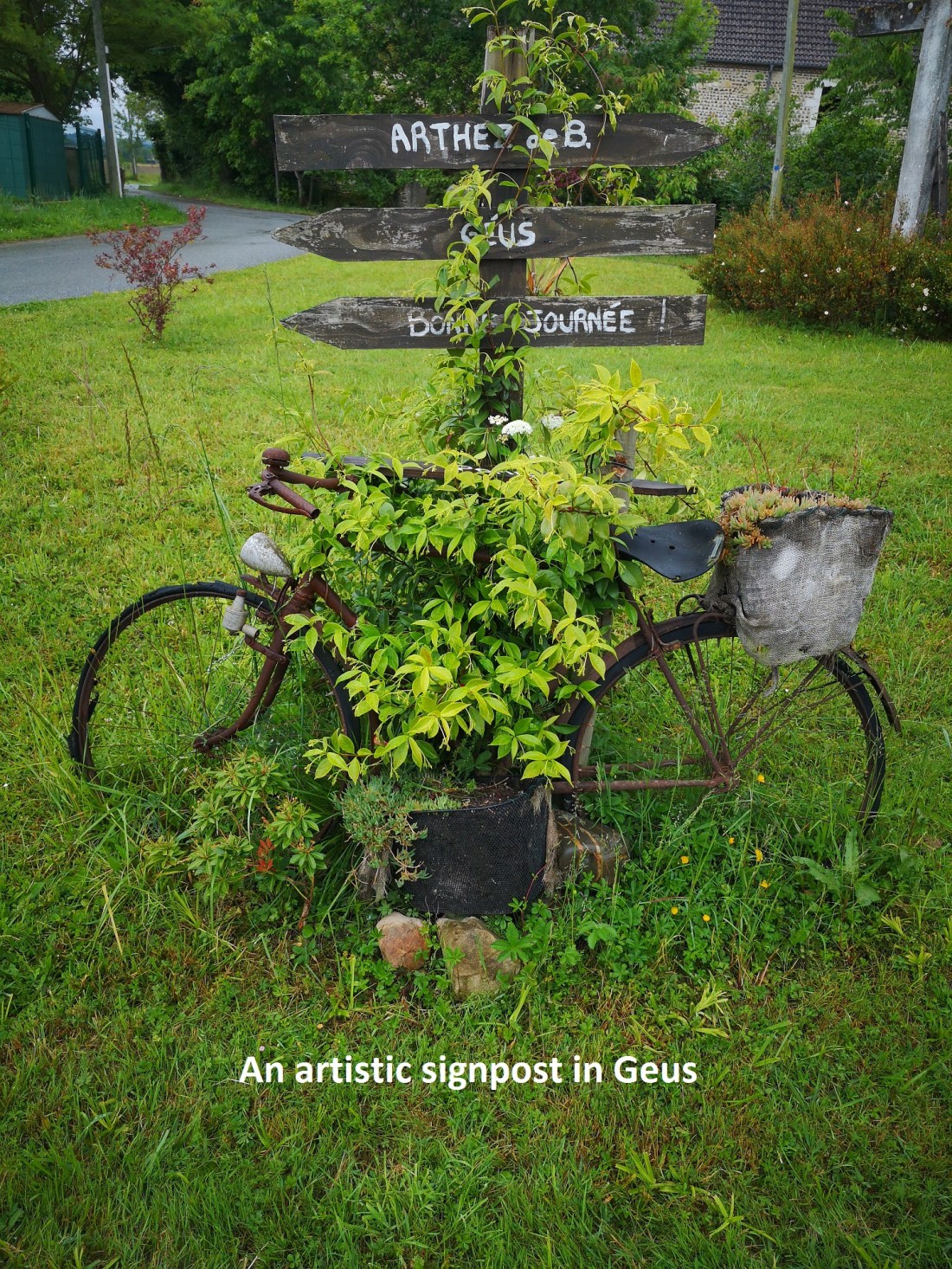 In these pages, I like to take note of the interesting and unusual. One such item was the signpost in the village of Geus, shown in the heading photo. What a way to use an old bicycle! The first sign points the way to Arthez-de-Béarn, the second tells you it is in