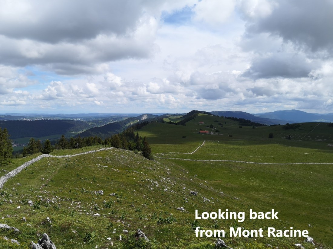 From Tête de Ran, the route goes on to the southwest, dipping only slightly below 1400m. Looking back along the route, it was possible to see the summits of previous days’ walks as well, back as far as Chasseral. It was not long before Mont Racine came into view. One of the features of this upland terrain is that it provides summer pasture for cows. In places the sound of cowbells provided a musical accompaniment to my walk.