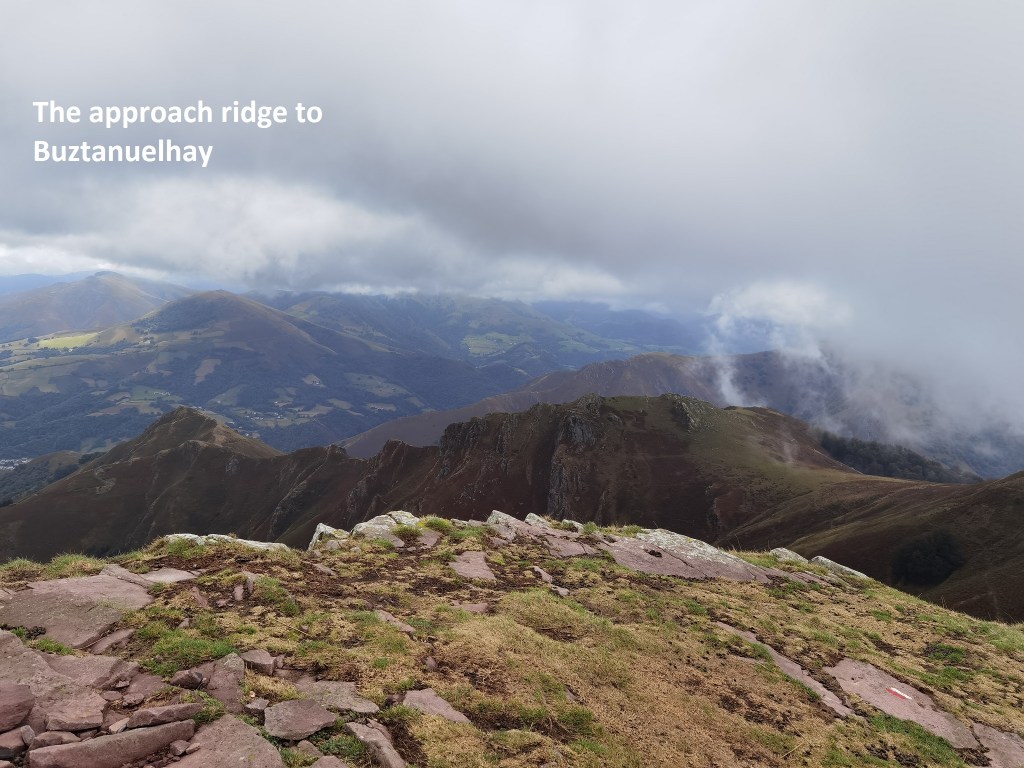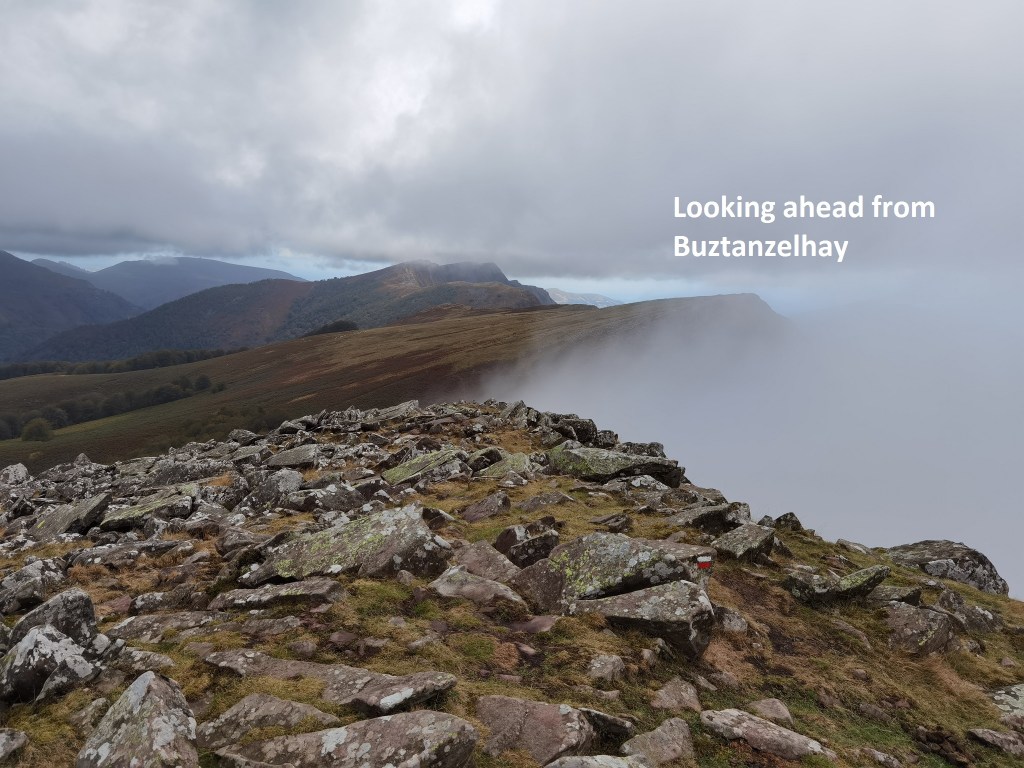 I didn’t delay, but went straight on to the summit. The route avoids going straight at the peak, but veers to the westward side, and then approaches on a more gentle slope for the final stage. And so I reached Buztanzelhay, a summit of 1029m. The route ahead showed swirls of mist here and there. But when I got to the next summit, Astate at 1022,, the mist had cleared, and I could look back at my approach route to Buztanzelhay.