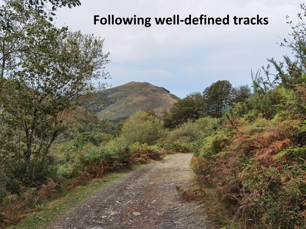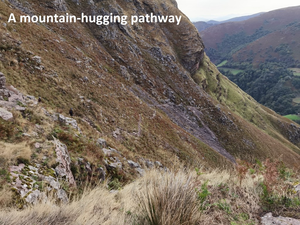The trail leaves the stream to wind its way uphill. At first the way is easy, following a road. Then, there is a foot track for a while, before it becomes one of those mountain-hugging trails again.