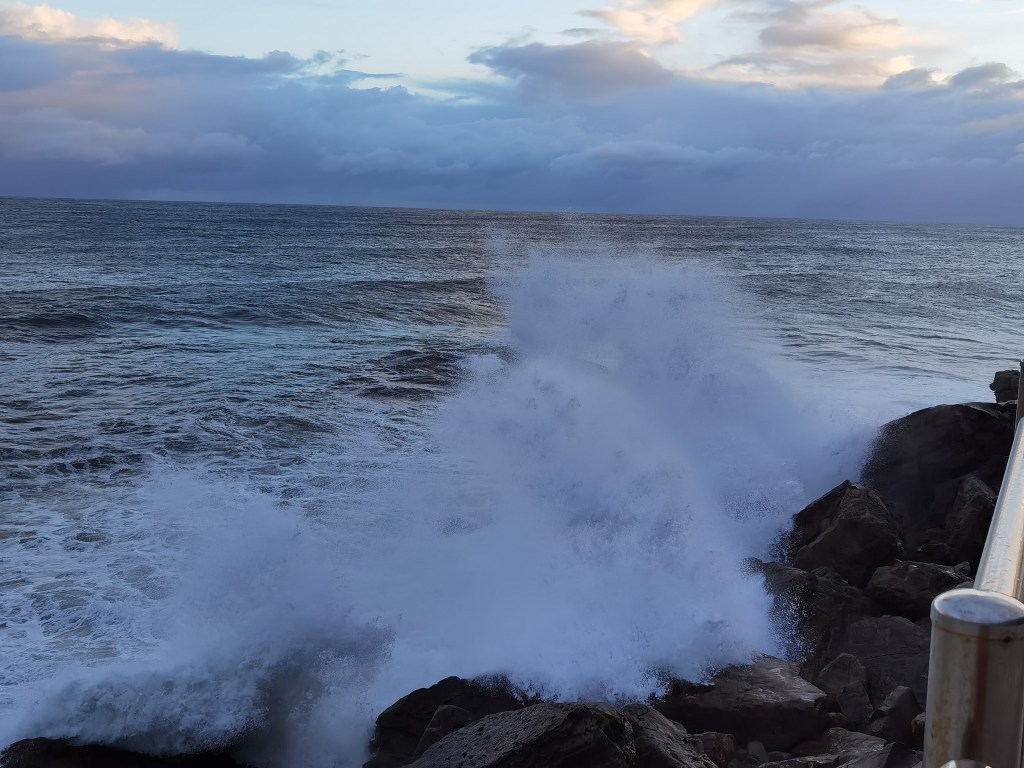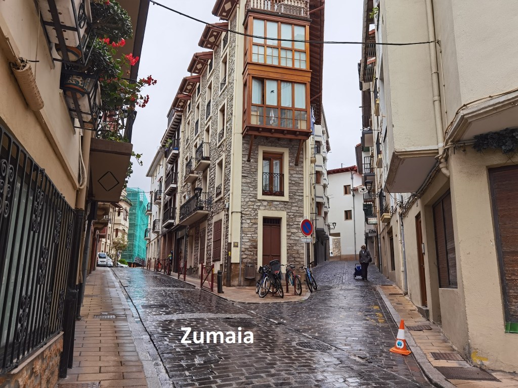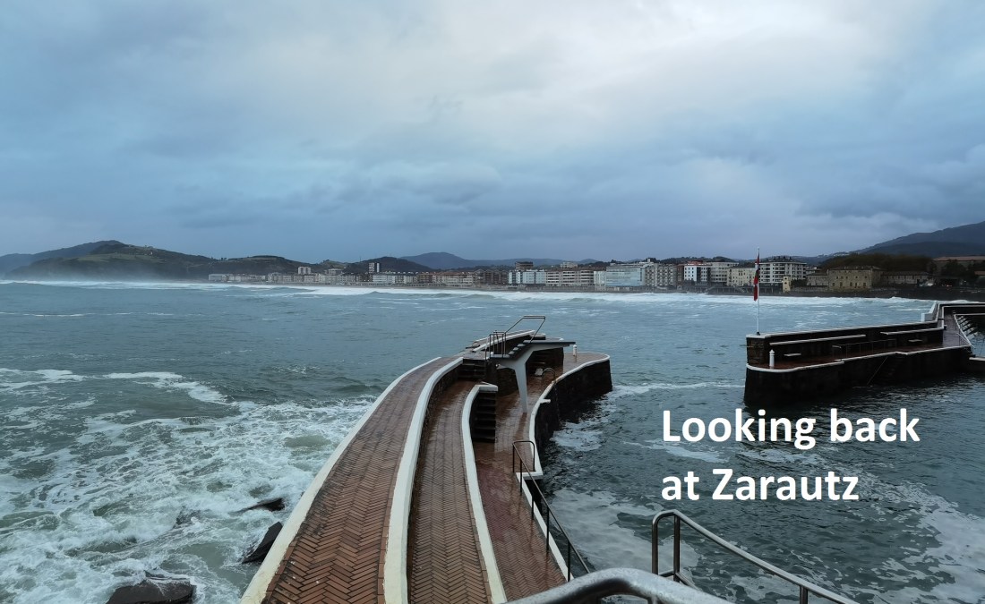 I left the accommodation in Zarautz shortly after 08:00. As I mentioned yesterday, I was hoping to visit the church there, but once again, it was completely closed. It was raining, and I was able to stop in the shelter of the church overhang to put on my raingear. And then I was on my way out of town. The first stage of today’s walk is a pathway beside the main road, and it is right on the seashore. In a few places, waves would occasionally break to spray the pathway, but for the most part, it was safe enough. There were clumps of seaweed on the pathway, remnants of the storms of a few days ago.
