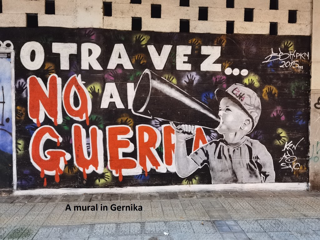 With enthusiasm, I got everything ready, and I was soon on my way. Gernika, as I mentioned yesterday, is a modern city, with very few remnants of the old town from before the bombing. So I did not spend time looking for old buildings or monuments. One of the features that I noted was the murals here and there. I often think that these murals are so much more effective at conveying a message than any of the scrawled graffiti that I see too often these days.