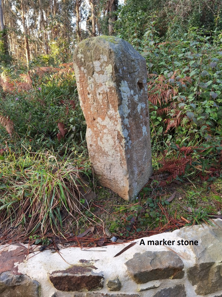 The trail ascended steeply after that, and after leveling out, I found myself looking back at the mist-shrouded town. It was clear that this was going to be a good day, and any remaining mist would soon disappear. I could enjoy the walk and the scenery. I had only had a light breakfast, so when I came to a lady selling refreshments outside her house, I was glad of the top-up. This kind of thing was common on the French part of my journey in previous years, but less so in Spain. I passed a marker stone, though again, as in other cases her in Spain, I am not sure what it represents.
