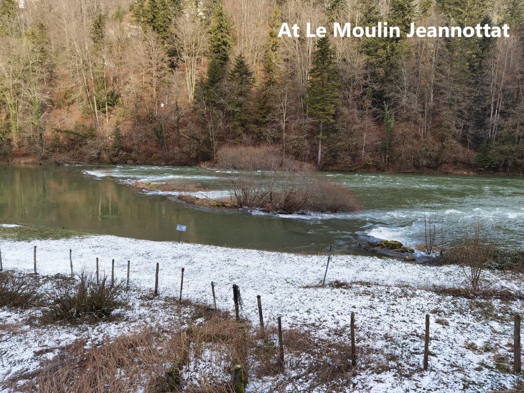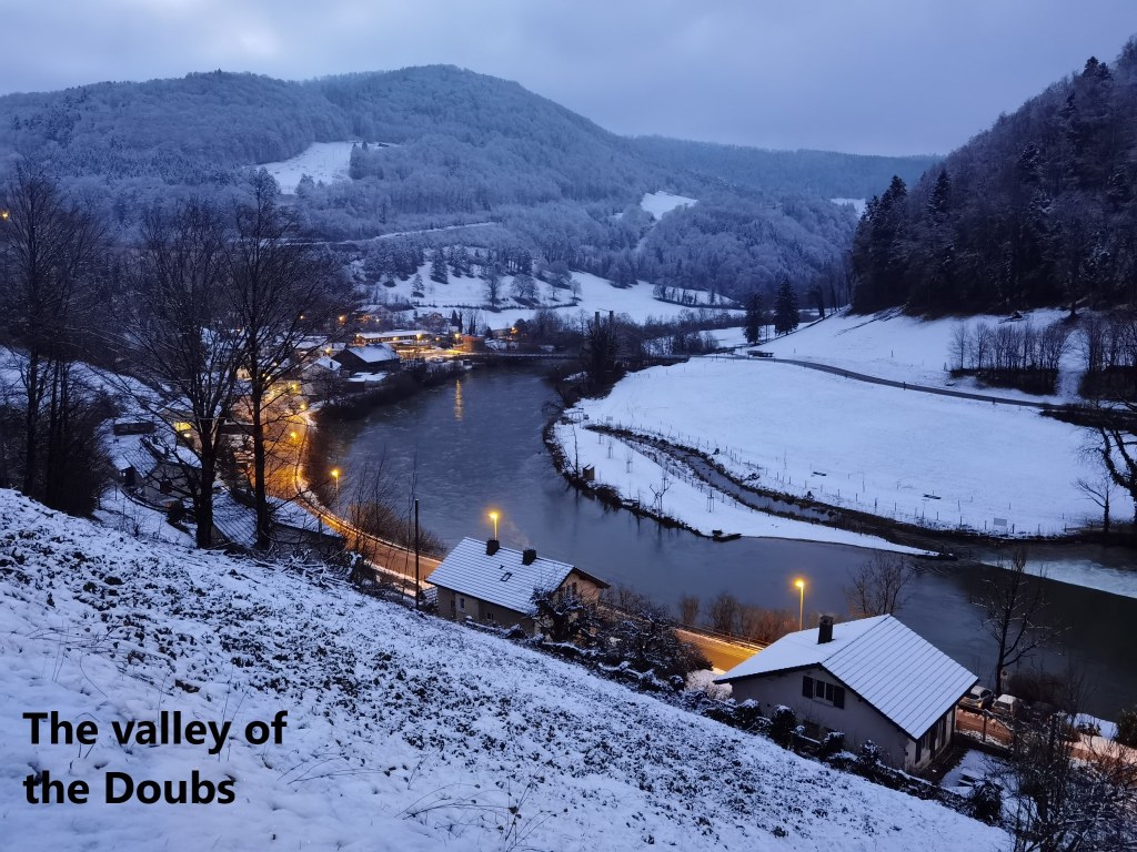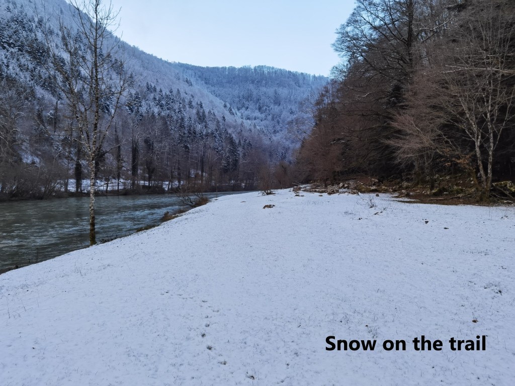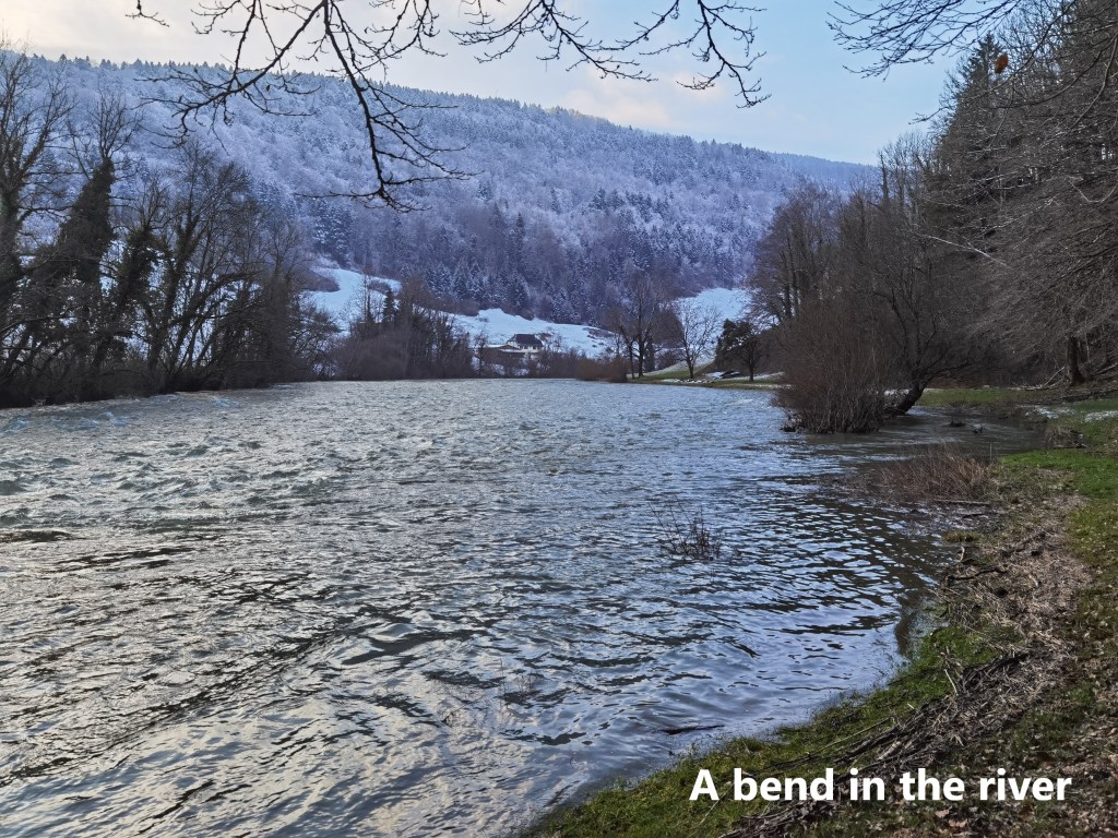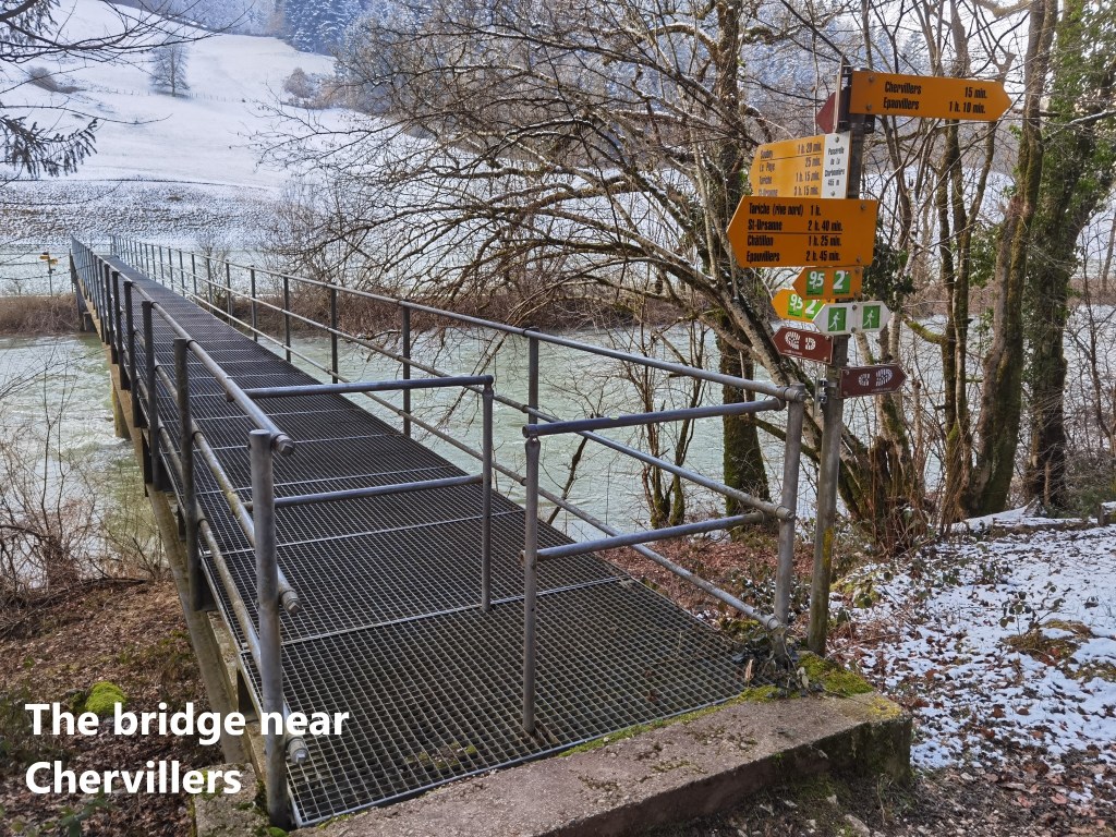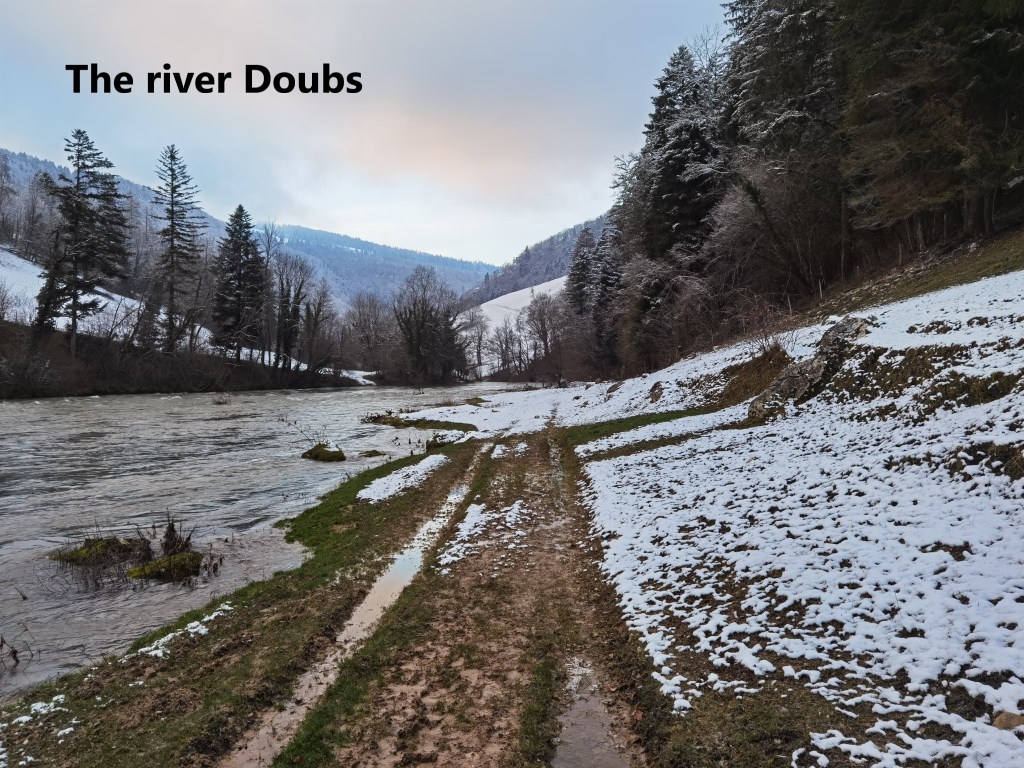 The route follows that left bank of the Doubs out into the countryside. The river was high, swollen from recent wet weather. In places, the trail was under a few centimetres of snow, and in paces, it was a muddy track next to the river. It wandered through fields and into and out of woods. Occasionally, there were small streams flowing down the mountainside to join the river, in one case presenting a cascade of small waterfalls.