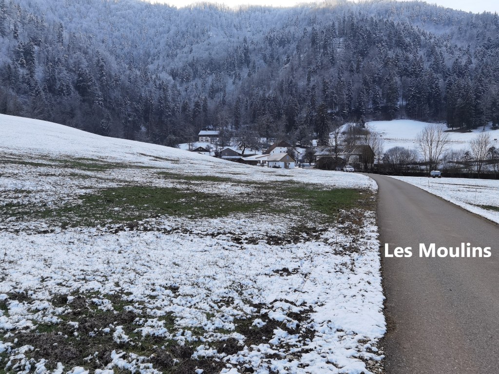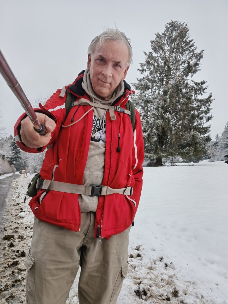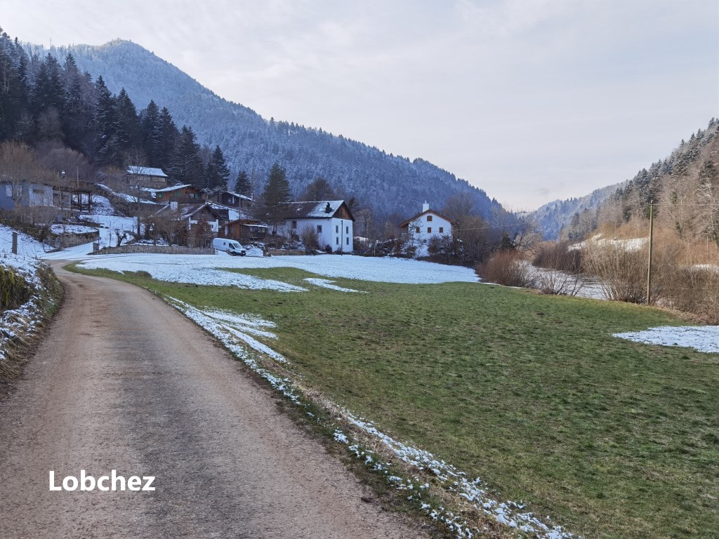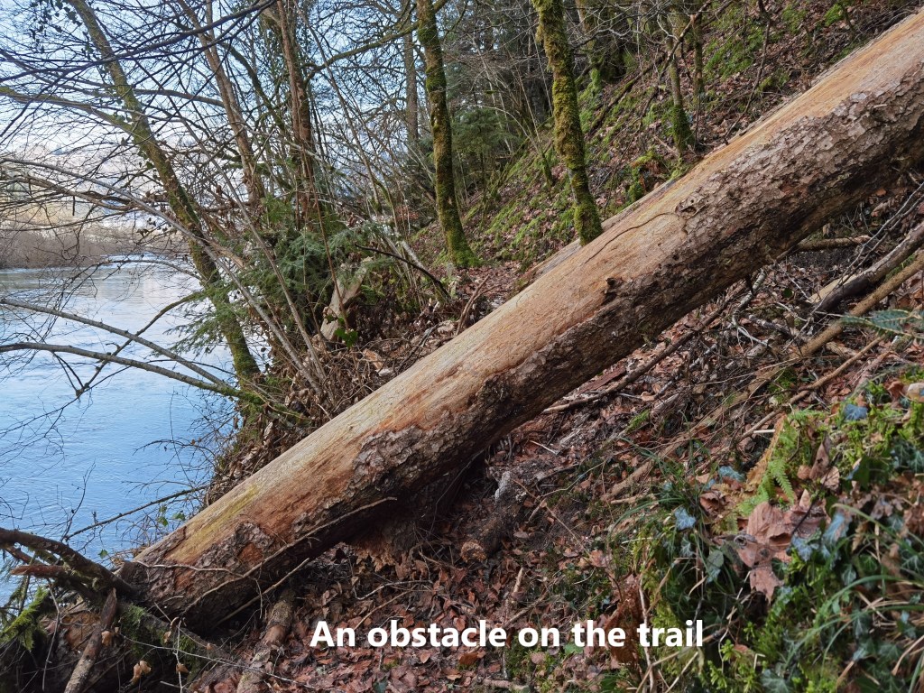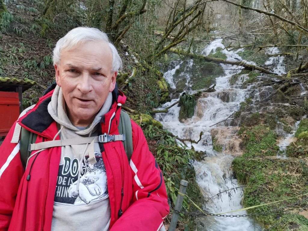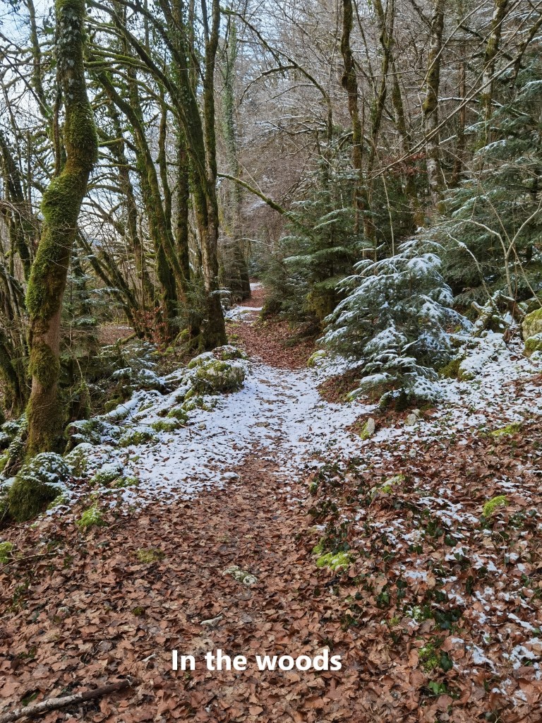 The route follows that left bank of the Doubs out into the countryside. The river was high, swollen from recent wet weather. In places, the trail was under a few centimetres of snow, and in paces, it was a muddy track next to the river. It wandered through fields and into and out of woods. Occasionally, there were small streams flowing down the mountainside to join the river, in one case presenting a cascade of small waterfalls.