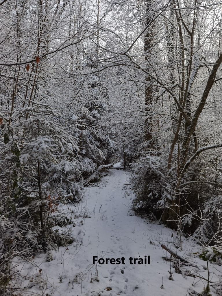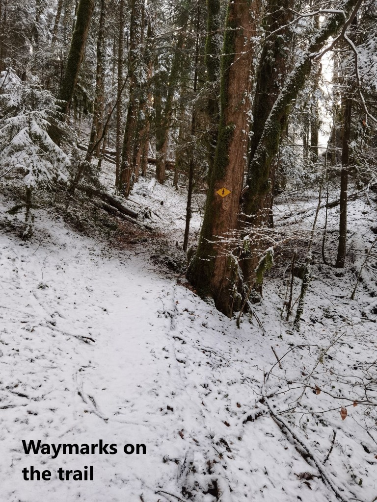 Up to this point, the trail was relatively flat. Id had not gone up or down by more than about ten metres at any stage. But at Le Moulin Jeannottet, the trail turns left and goes straight up the slope. Along by the river, the snow was generally patchy, but once I started up the slope, I was soon into constant snow cover. The trail was covered, but the route was just clear enough, and the waymarks just frequent enough that getting through the forest was not difficult on the initial parts of the ascent.