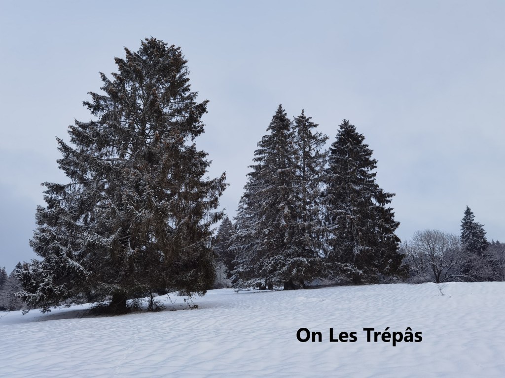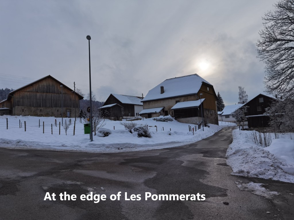 It was actually on the open stretches, where the route was harder to find, that I really had to be careful. There were no footprints there before me. It looked like no one had gone this way in at least a couple of days. There were animal tracks that were more or less following the route that I was going, but animals go their own way, and I could not risk following them as a guide. Also, the snow was getting deeper. Once I passed through the 800m contour, it seemed like the snow was 25cm or 30cm deep. It got deeper as I went over the ridge of Les Trépâs, and reached the village of Les Pommerats.