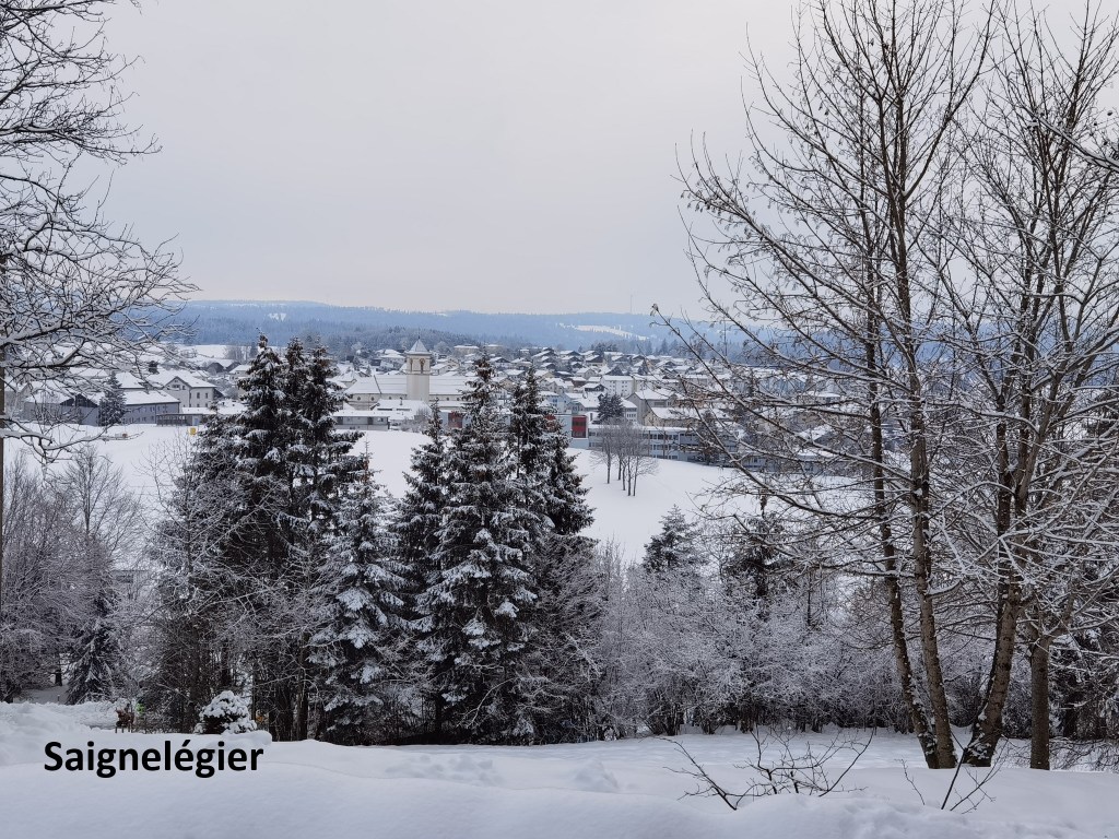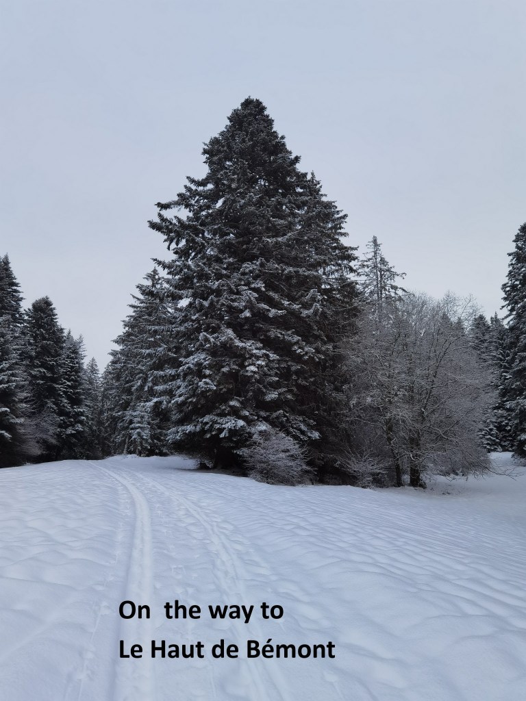 The route does not go right into the village, but takes a sharp turn to go on towards Saignelégier. But with the exact trails hidden in the snow, the choice of direction had to be considered carefully and frequently. I took a small detour to reach the summit of Le Haut de Bémont, plodding through deep snow to get there. Walking in deep snow with just hiking boots is difficult, you sink in, and it saps your energy with every step. But it was worth it. And from the summit it was all downhill to reach Saignelégier.