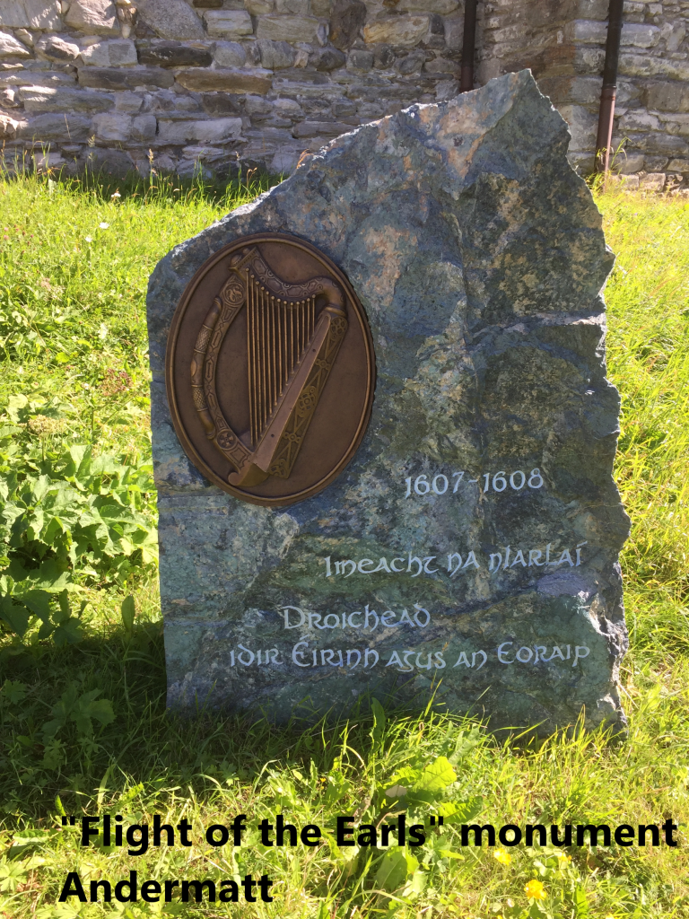 Just in front of the church is a monument marking a pivotal event in Irish history. In the late sixteenth century, the Irish leaders in Ulster, Hugh O’Neill and Hugh O’Donnell, led a relatively successful campaign of resistance against English advances in the northern part of Ireland. They harassed and ambushed every army that came against them, but failed to capitalise on their successes, while waiting on support from Spain. When a Spanish army did eventually come, it landed in Kinsale in the far south. The Spanish army was immediately besieged in the town by the English. O’Neill and O’Donnell marched their men south through winter weather and blockaded the English army. The ensuing battle was the first time the Irish took the field in standard formation on open ground. Lack of Irish experience of pitched battles, and poor coordination with the Spanish led to an Irish defeat. O’Donnell left Ireland for Spain shortly afterwards. His son, Rory O’Donnell and O’Neill were forced to make peace with the English in 1603. But they knew that they were not safe, and in 1607 they left Ireland, landing first in Spain, then in France to go on the Rome. They passed through Andermatt and over the St. Gotthard pass in March 1608. It was the end of Gaelic Ireland with its own laws and traditions. Soon after, the English colonised Ulster, leading to the problems which still persist today. The monument in Andermatt is a small but poignant remember of the passing of these last leaders of Irish resistance to English rule.
