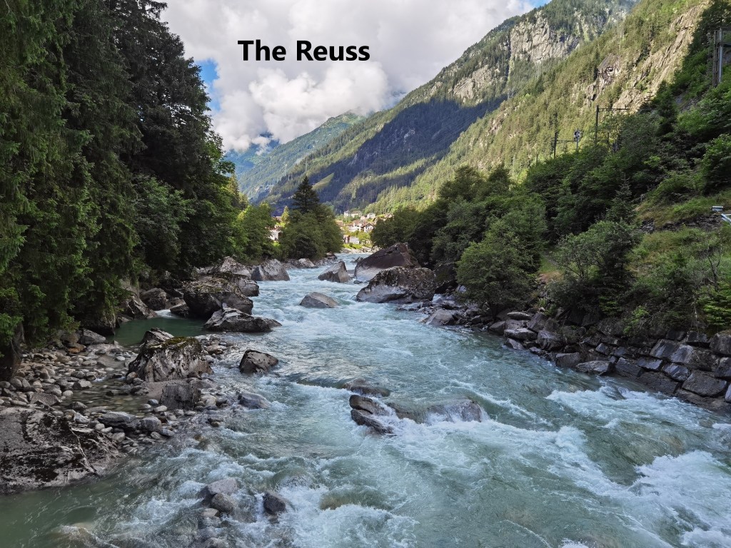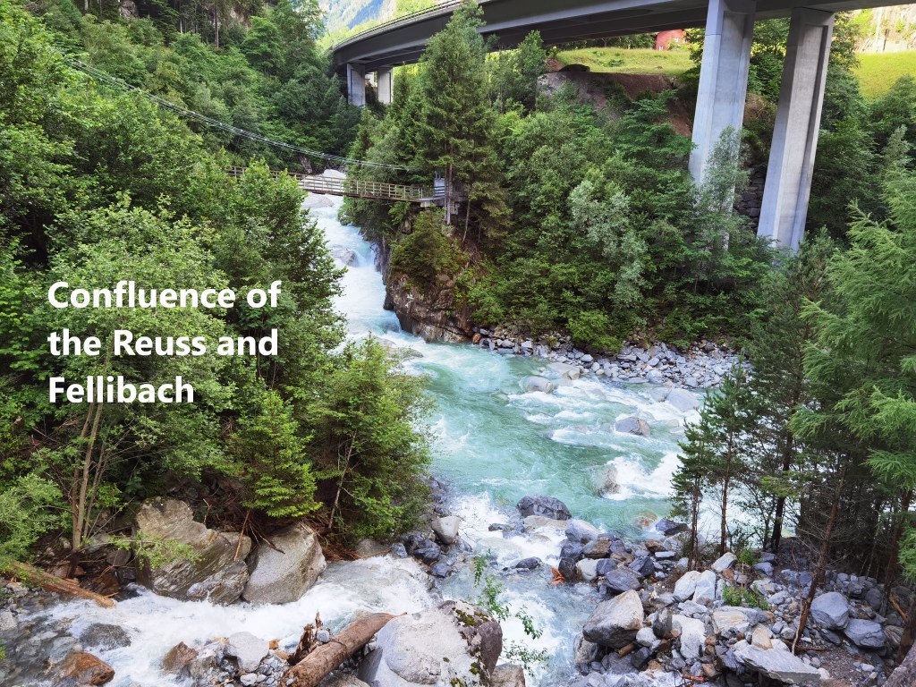 The weather has not been kind recently, but it was sunny when I started out from the bus stop at Meitschligen. The route follows the eastern side of the valley up above the river Reuss. I walked in between avalanche nets for a while and soon came to the place where the Fellibach and Reuss rivers meet.