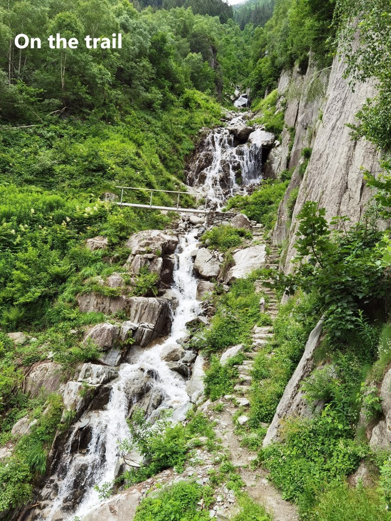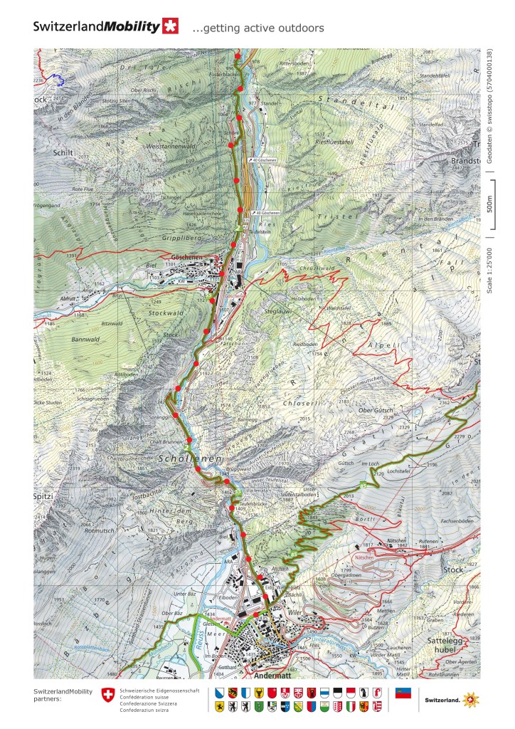 The trail does not go into the middle of Göschenen village, but stays close to the railway line. The standard gauge line goes into a tunnel just past the train station, but a narrow gauge line of the St. Gotthard-Matterhorn railway continues on up the valley. My route took me alongside this railway until I came to the Häderlisbrücke.