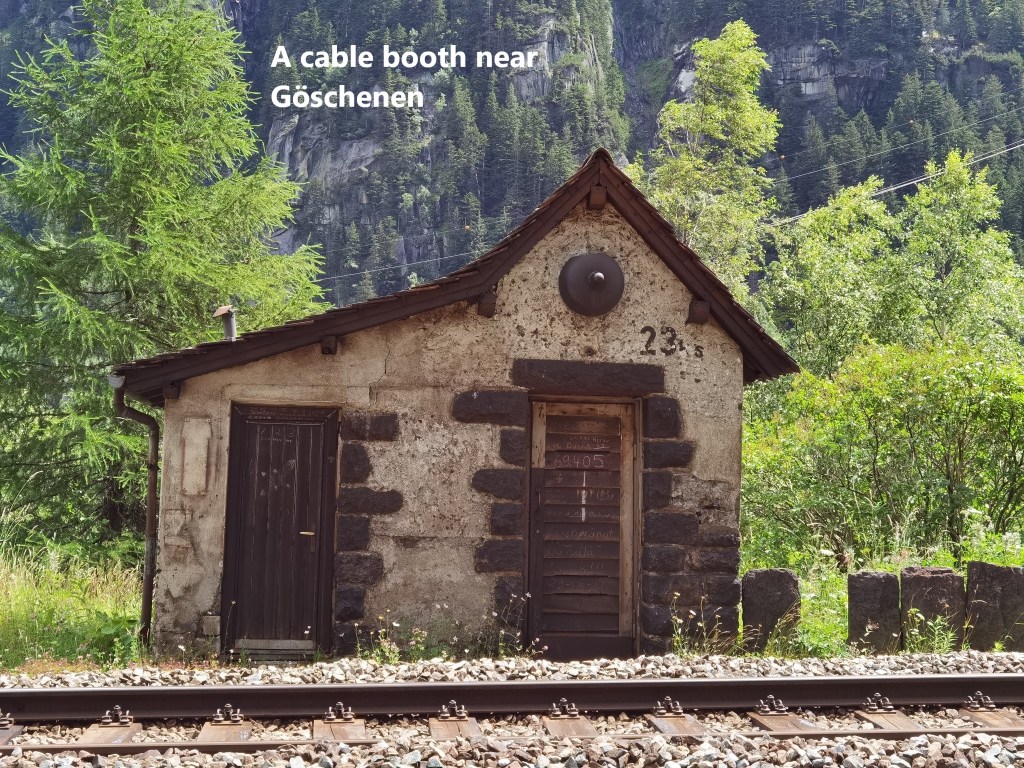 The trail levels off when coming near Göschenen. One of the first signs of approaching that village is the cable house beside the railway. Long before the line was electrified, cables were used for telegraph and signalling systems. The points where cables were joined together were enclosed in these cable booths for protection. A few of these still remain along the line, and the one at Göschenen is in relatively good condition.