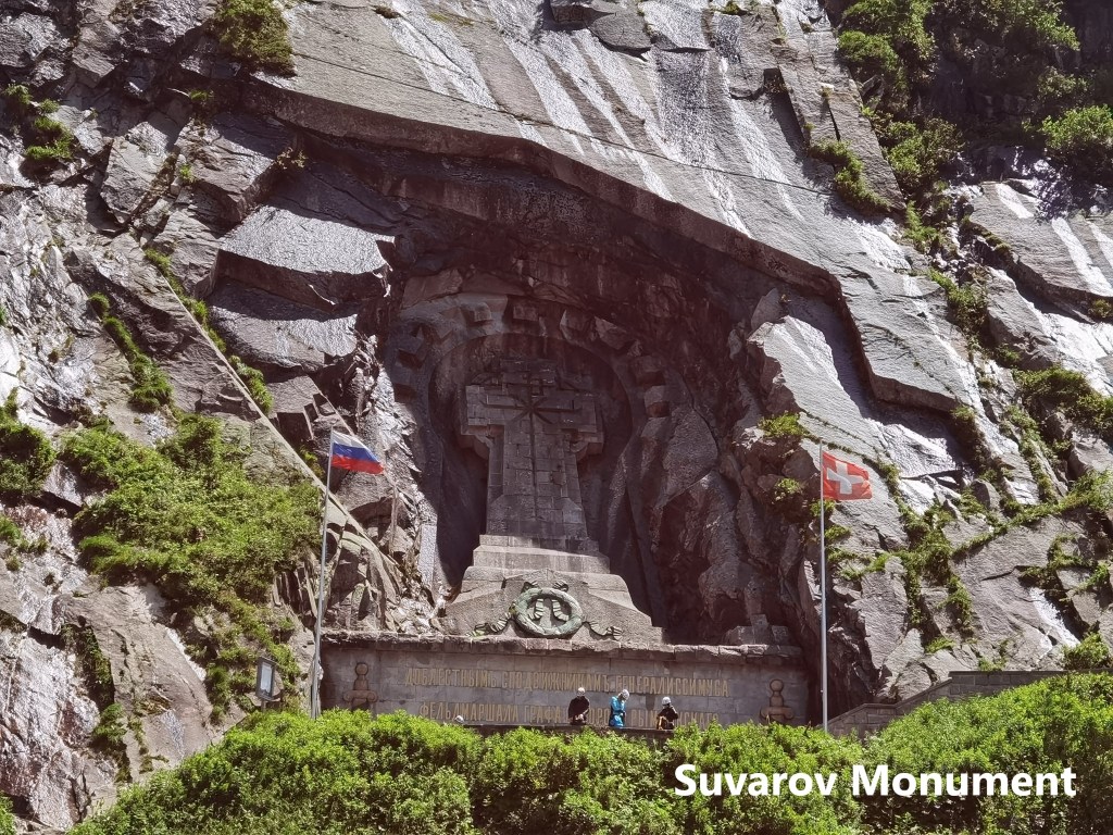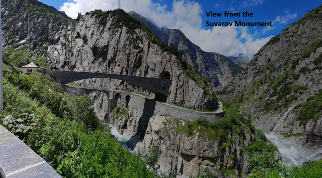 In September 1799, a combined force of Russian and Austrian armies forced a French army from the Gotthard pass itself back into the Reuss valley. Just below the village of Andermatt, the Reuss goes into a gorge. At the same time, the steep sides of the valley make it necessary that an army going down the valley would cross from the right bank of the river to the left. The French army crossed over and cut the bridge behind them. Suvarov brought in heavy wooden beams, and reportedly tied them together with the sashes from the officers’ uniforms. His army laid the beams over the break in the bridge and forced the crossing. Despite heavy losses, they pushed the French army all the way down the valley as far as Altdorf. The monument, with Russian and Swiss flags, commemorates the series of battles that took place here.