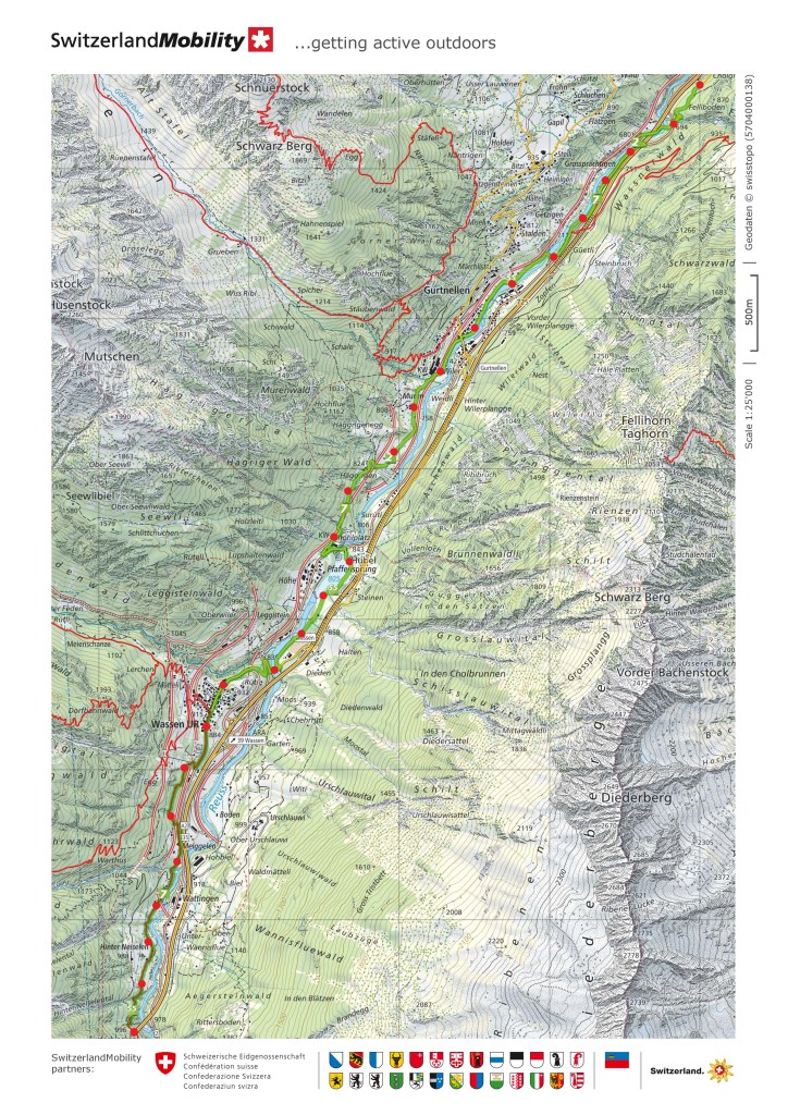 The trail then crosses over to the other side of the Reuss, and heads southwards to the village of Gurtnellen. This was gentle walking, with the route only ascending seventy metres in a little over three kilometres of distance, and I made good time.