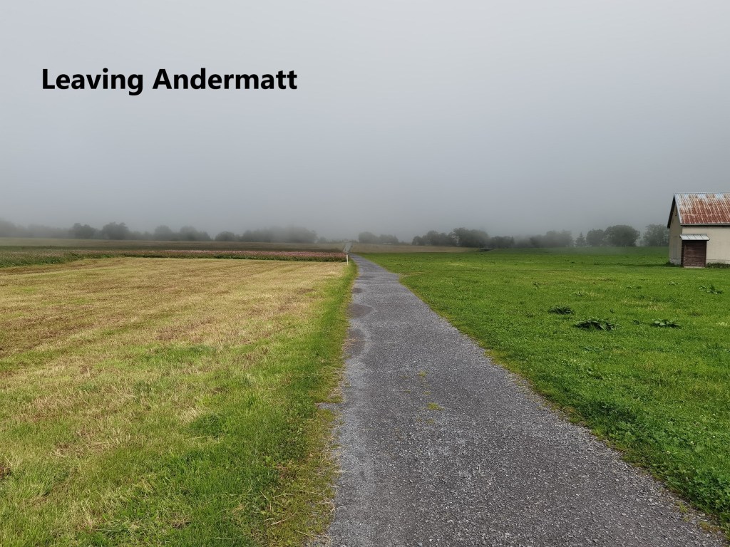 The morning was misty, despite the promise of good weather from the forecasters. The route crosses over the Reuss, much tamer now that the ground is fairly flat. It passes alongside the local golf course. A gold course in an Alpine valley is not something I expected, but there it is. The trail weaves its was around the edge of the course before following the bank of the Reuss to reach the village of Hospental.