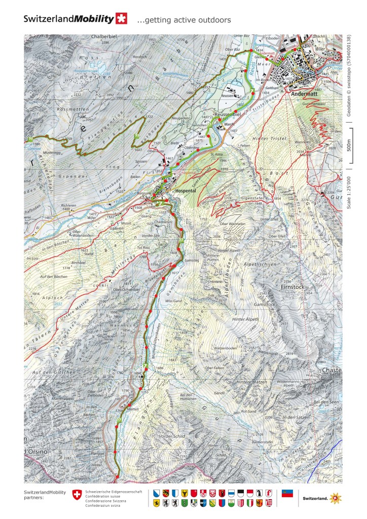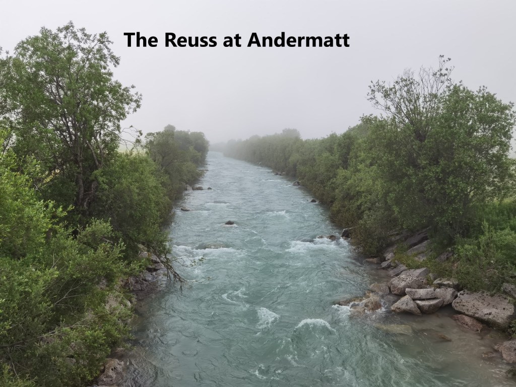Hospental is also important in terms of the Reuss. The river Reuss is the combination of two smaller streams that come together at Hospental. The Gotthardreuss starts up near the St. Gotthard pass, while the Furkareuss starts to the west near the Furka pass. They meet at Hospental, and from there are simply known as the Reuss, the river I have been following in recent stages of my journey. From Hospental, my route followed the Gotthardreuss upstream.