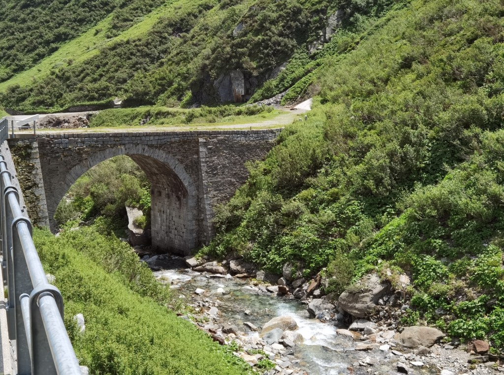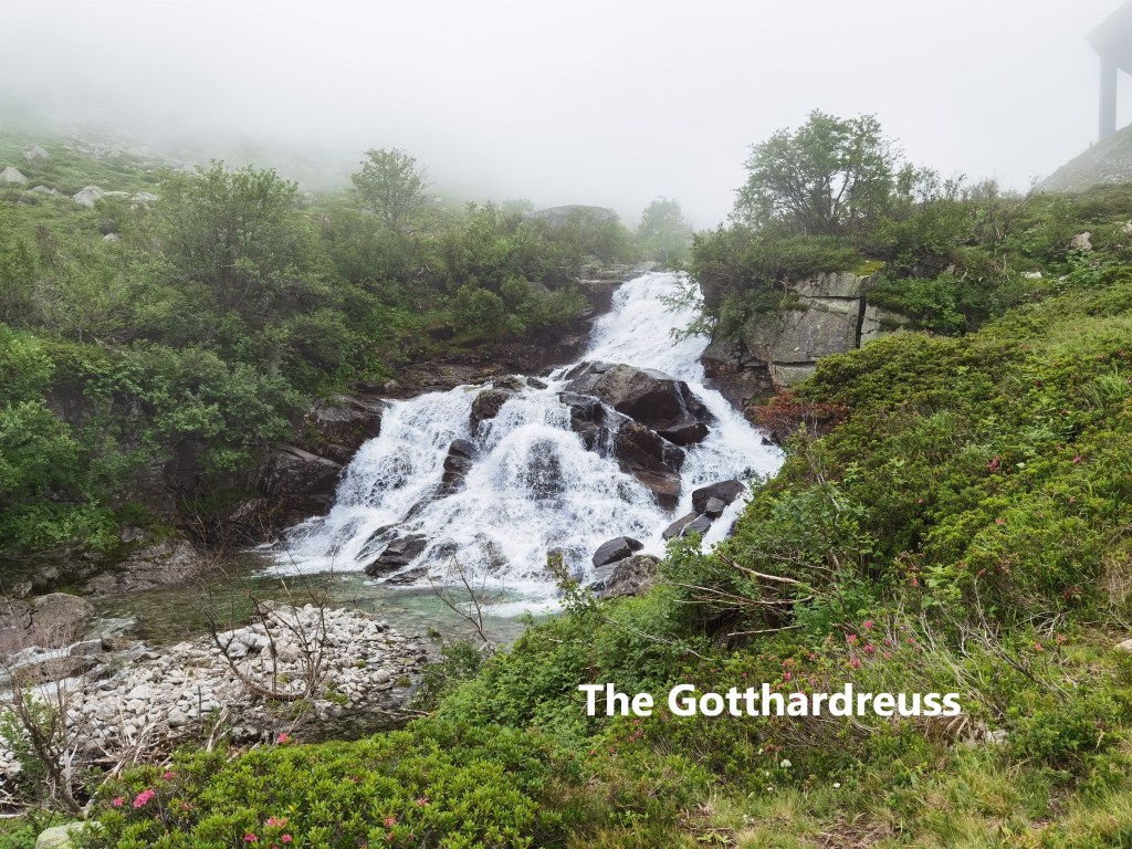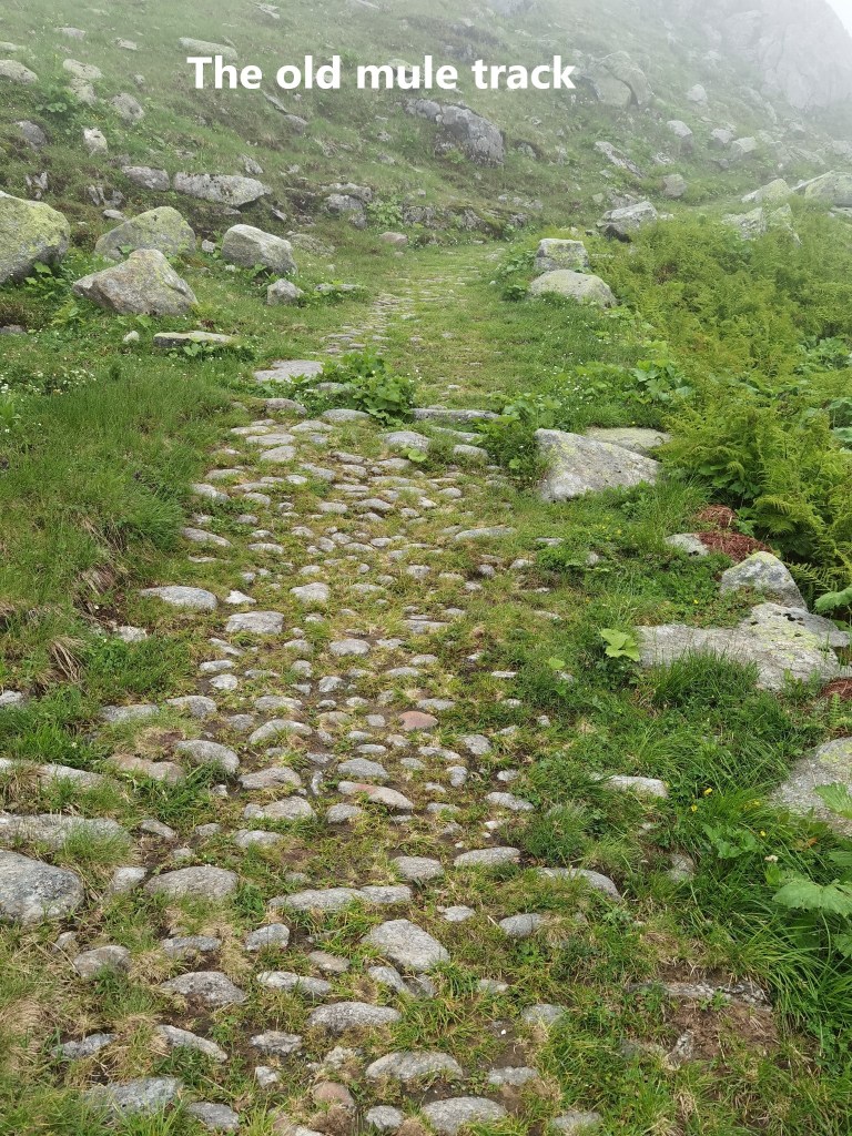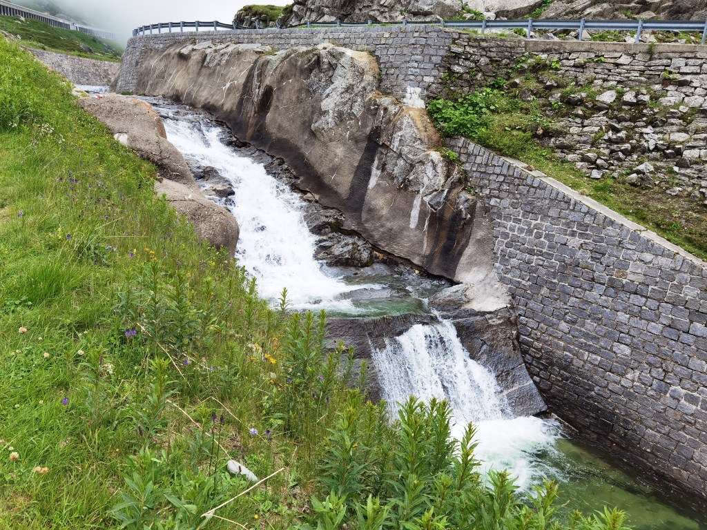 The river was smaller now, but it still has plenty of white water cascades. I was up into the mist now, with visibility down to about two hundred metres. The trail follows close to the river. It seemed to follow an old mule track. The first traders to come across the pass would not have had wagons. It would have been pack animals, mules and horses, making their way through the uneven terrain. Somewhere through the years, a stone road was laid down, and that is the trail that I was following. The use of the route for commercial purposes goes back to the thirteenth century when the first wooden bridge was built across the Reuss at Andermatt. It seems like traffic has been increasing for eight hundred years since then.