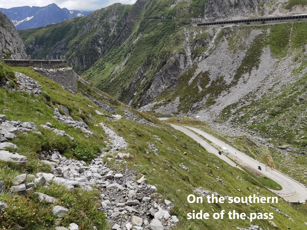 The pass itself is in Ticino canton, also known as Tessin. I started out on the trail back in January with greetings of “Bonjour” to my fellow walkers. Then it was “Gruetzi” as I went through the German-speaking cantons. But from here on, in Italian-speaking Ticino, it would be “Buongiorno”. Such is the variety and harmony of Switzerland.