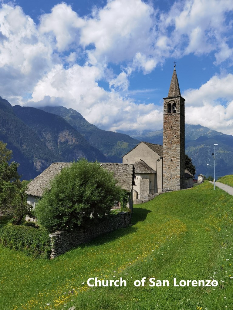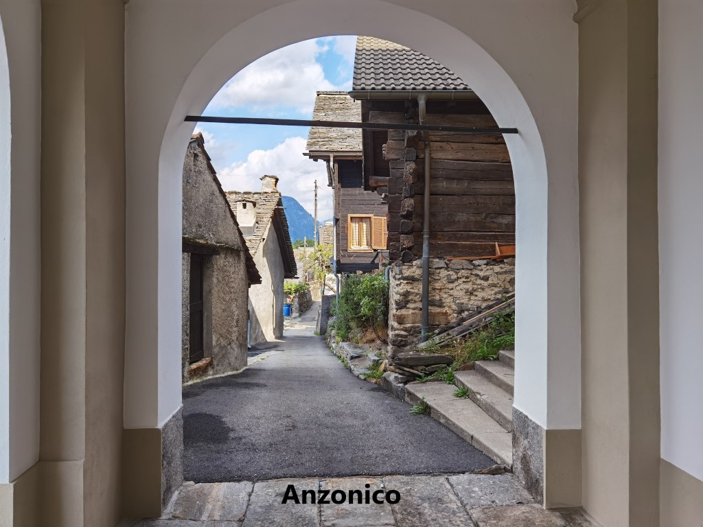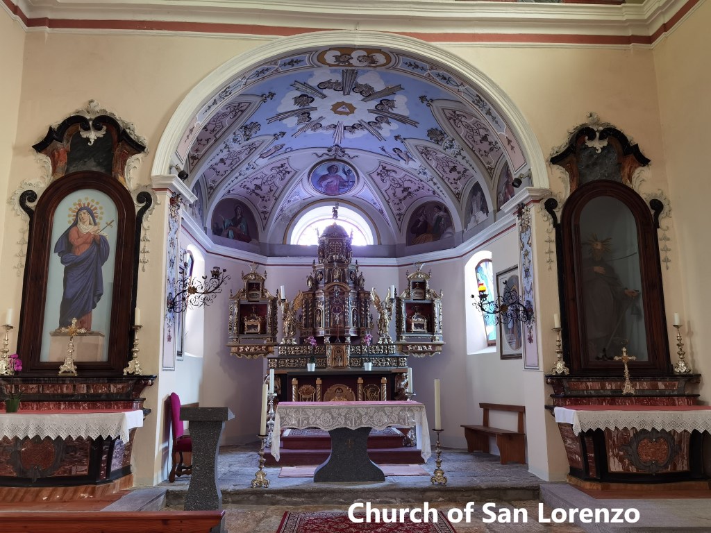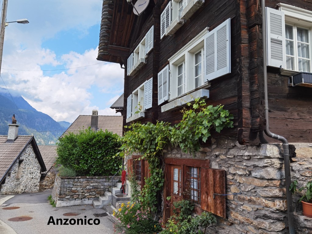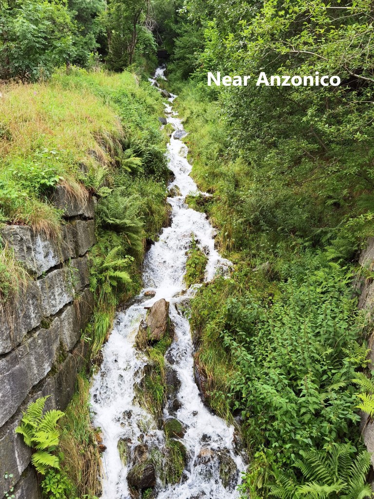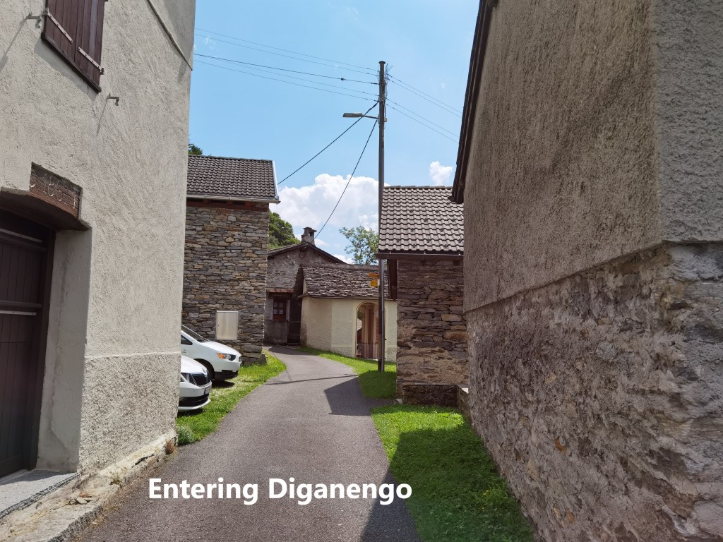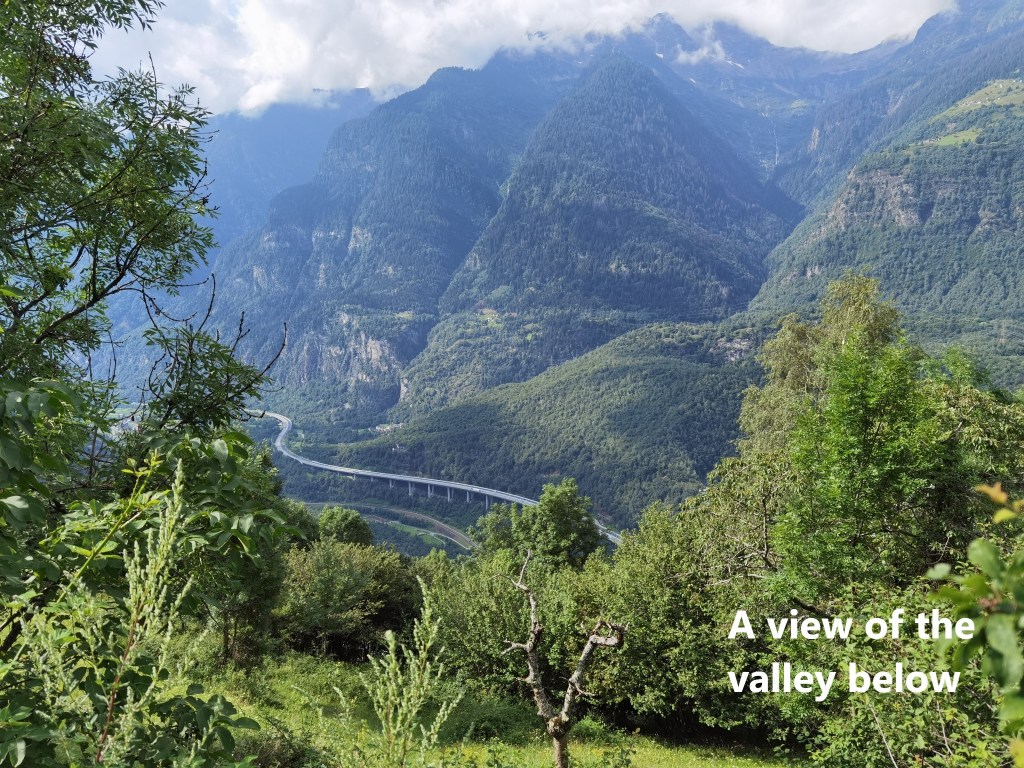 The final part of the journey to Anzonico, in a small bus, is an interesting one. The bus has to negotiate a series of hairpin bends as it climbs to the village. I arrived there in bright sunshine, so before heading off on the trail, I took a stroll around the village. The village goes back hundreds of years, but there was a devastating avalanche in 1667 which destroyed most of the village, including the church, and killed dozens of people. The current village is moved slightly from the original, and includes a new church. There are only about a hundred permanent residents, with the rest of the properties being holiday homes. Space is at a premium, meaning there are small streets and houses very close together. And yes, in the photo here, that really is a street going through the porch of a house, such is the layout of the place.