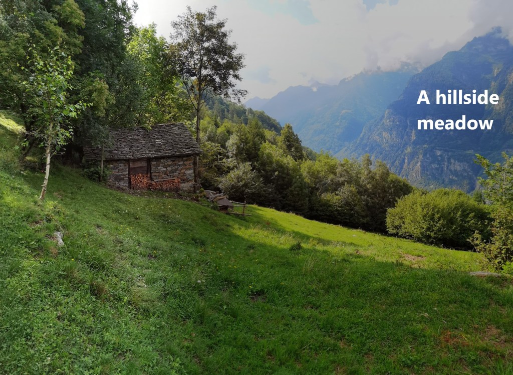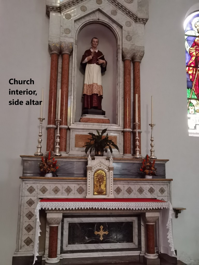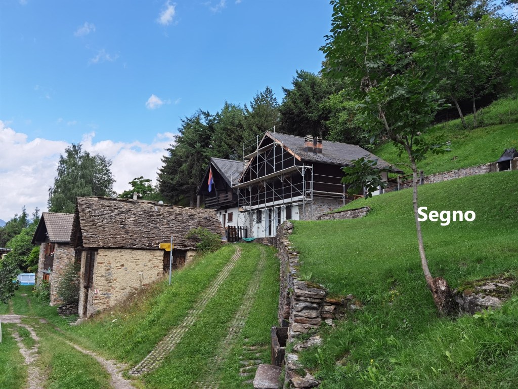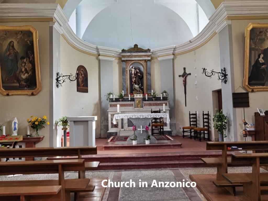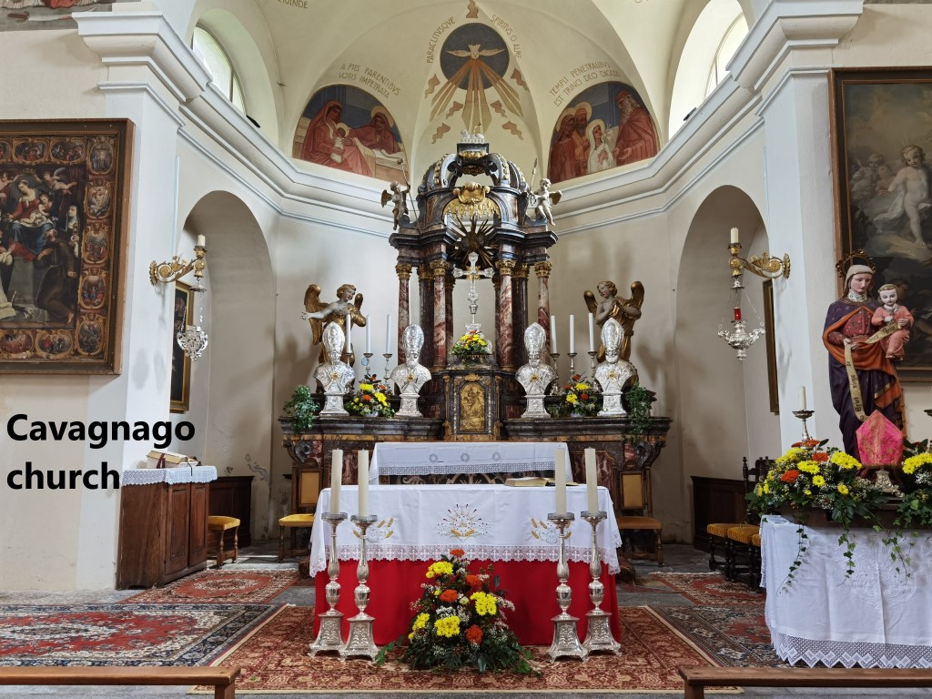 The trail descends from Segno and passes through some pastureland to reach the next village, Cavagnago. Historically, the first mention of Cavagnago was in chronicles of 1270. It was linked to the nearby village of Sobrio. Initially, both villages worshipped at the church in Segno, but in in 1585, Cavagnago and Sobrio formed an independent parish. That did not last long, and Cavagnago established itself as a separate village and parish in 1611. The church in the village dates back to 1587 and was renovated in 1934. One of the interesting and quite unusual features of the church is the series of busts of four bishops on the main altar. The altar itself is solid marble.