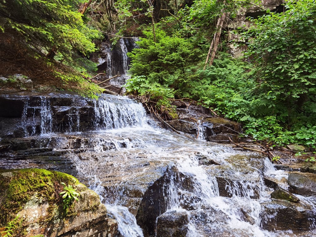 I dropped in at the church on my way out of the village. And I passed my first stream with its white water cascade. Then I was on the trail in earnest. It is a good trail with easy walking. The trees on the right side did not allow great views of the valley below, but in places they thinned out. Some of those places were small fields given over to pasture for animals. But in other places I was looking straight down at the valley.