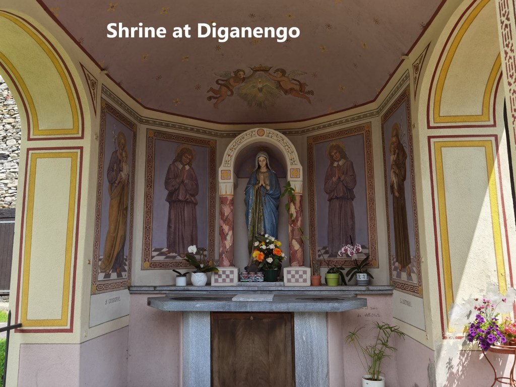 After Sobrio, the trail gets narrower, sometimes squeezed into a ledge between rocks on one side and a steep drop on the other. I continued to pass waterfalls and cascades. And so I came to the last real village on this section of the route: Diganengo. Diganengo is so small it does not even have a church, though it does have a very pretty shrine in the middle of the village. It is testimony to the dedication of the villagers that the shrine was being decorated while I was there.