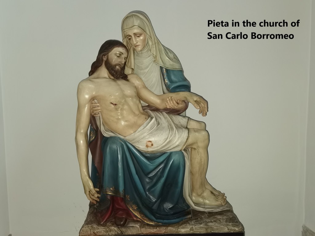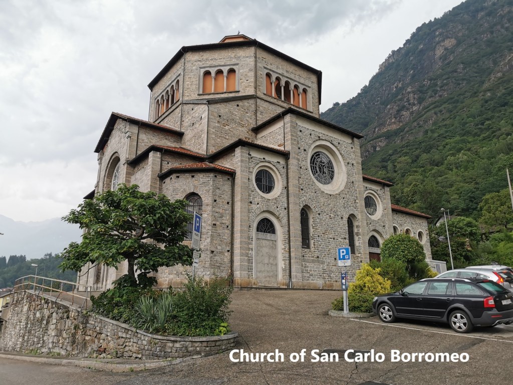 I reached Pollegio just as the first drops of rain were falling. The route from there is flat. I went through the village to reach the Ticino river, following it for a short time before turning towards Biasca. Crossing over the old bridge over the Brenno river brough me into Biasca itself. I could not resist looking at one more church before going to the railway station. The church of San Carlo Borromeo looks impressive from the outside, but the interior is quite sparse, though it does have a nice statue of the Pieta. The smaller village churches that I visited on the way were more interesting.