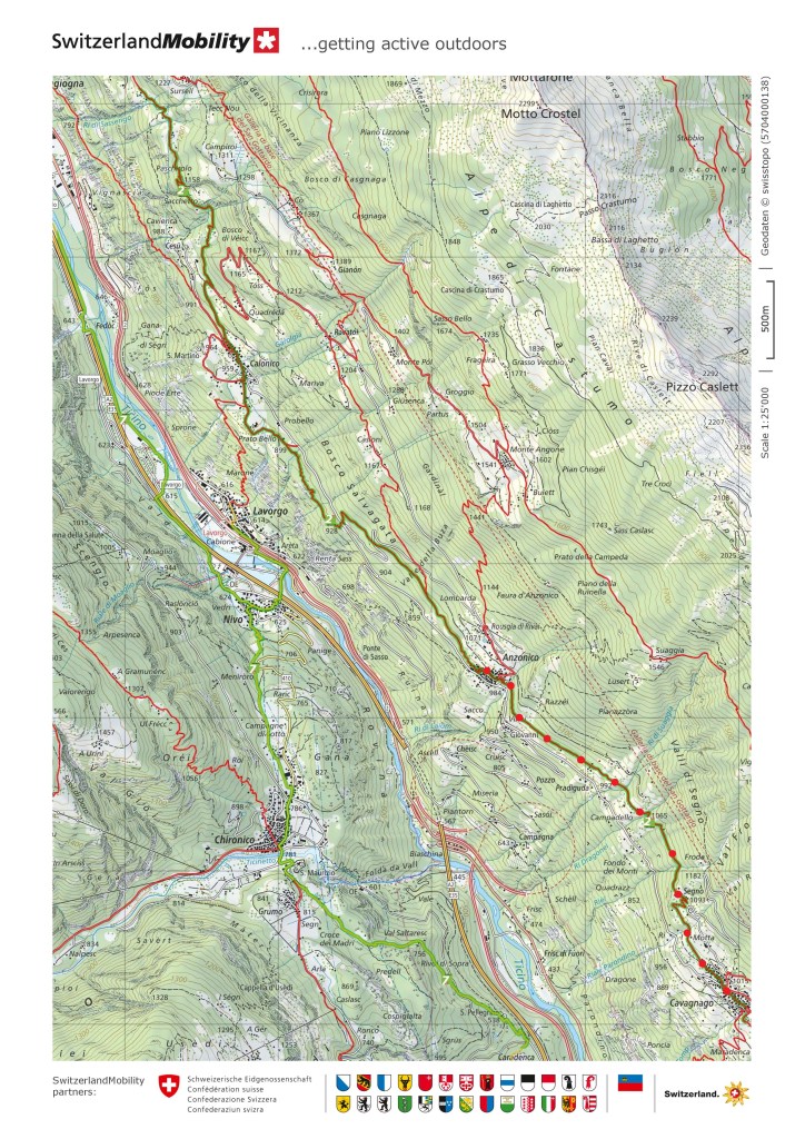 After Diganengo, the trail starts to go downhill. It passes through one more settlement at Corecco, and shortly after that takes a sharp turn to the right. It goes through a series of seemingly endless zig-zags to descend four hundred metres to the village of Pollegio.