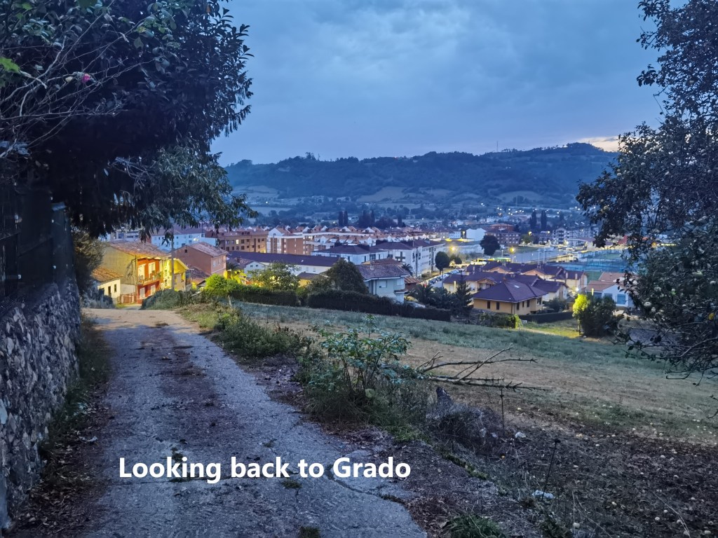 I left Grado as the dawn was breaking. The lights were still on, and the town was quiet in the early morning. The route immediately starts to go uphill, and looking back, I had a good view of the town.
