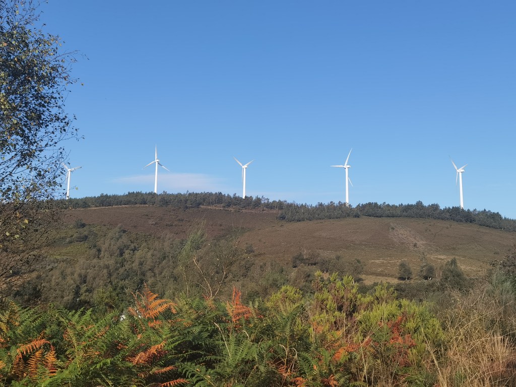 The trail crosses the main road between the provinces, but is more direct in its ascent. The ridge carries a line of wind turbines. Although they seem to be rotating gently in the breeze, they actually make a considerable amount of noise, and this was the background going to the higher points of the slope.