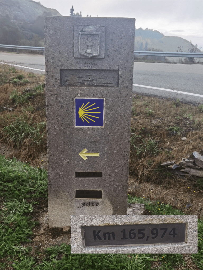 Reaching the top, I had great views back towards the valleys of Asturias, still in mist. And then I was over the ridge. I had crossed from Asturias into Galicia, though at first sight it did not seem very different. The route descends through the woods, and it was not until I came to the road that there was the first of the Galician markers. In other provinces, the route markers give direction only, but in Galicia, they also give the distance to Santiago. My first marker in Galicia told me that I had just under 166km still to go.