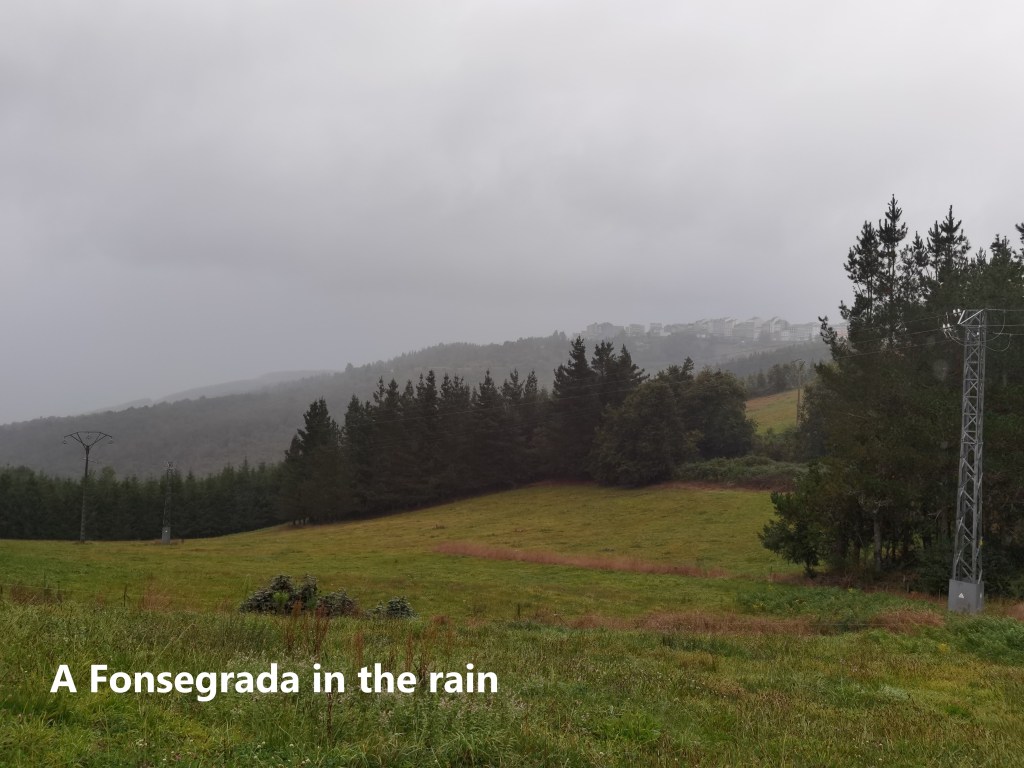 I had lunch in A Fonsegrada, and when I came out, I found it had been raining, with the sky threatening more rain to come. And sure enough it did. Most people stop in A Fonsegrada, but having started in Castro, I was going farther. Just outside A Fonsegrada, the rain came, and I had to take out my raingear.