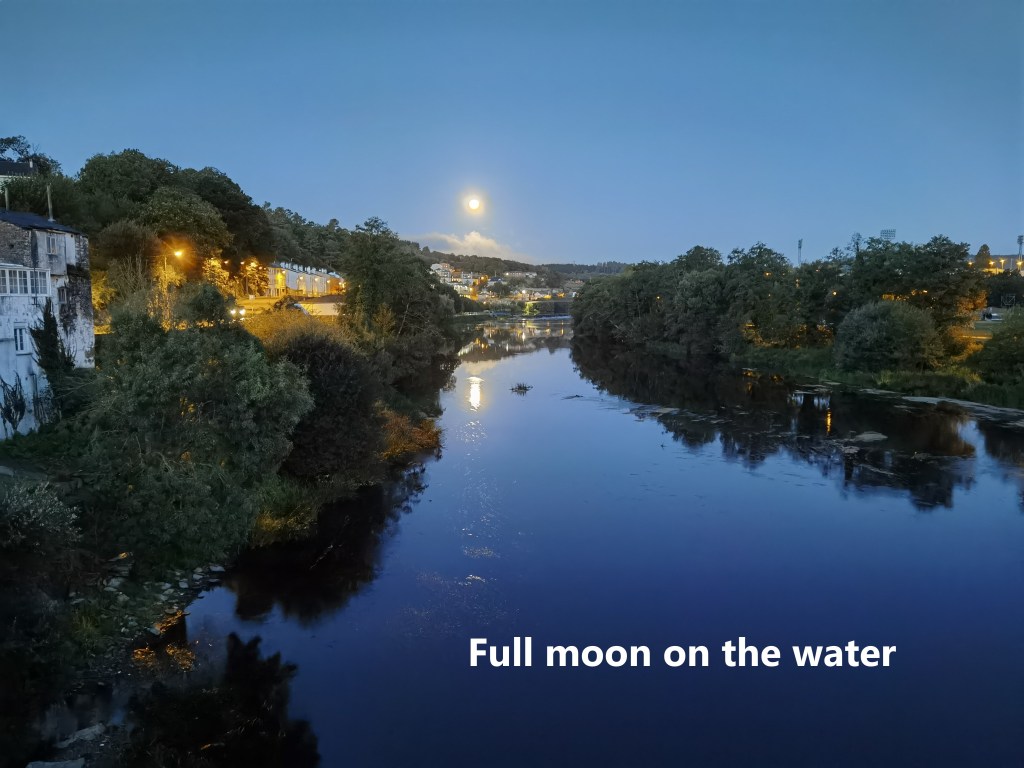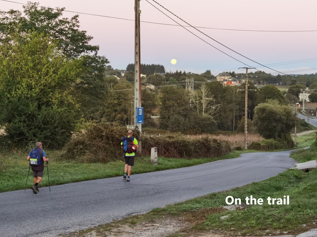 I reckoned that at a walking pace of 5km/hour, and allowing a lunch break and two refreshment breaks totalling about one hour, the 47km distance would take me about 10 hours to complete. So I left Lugo in the early morning at 07:30. It was still half dark, with the full moon still in the sky. But the dawn came quickly. The route is along the road for this part, which allowed me to make good time.