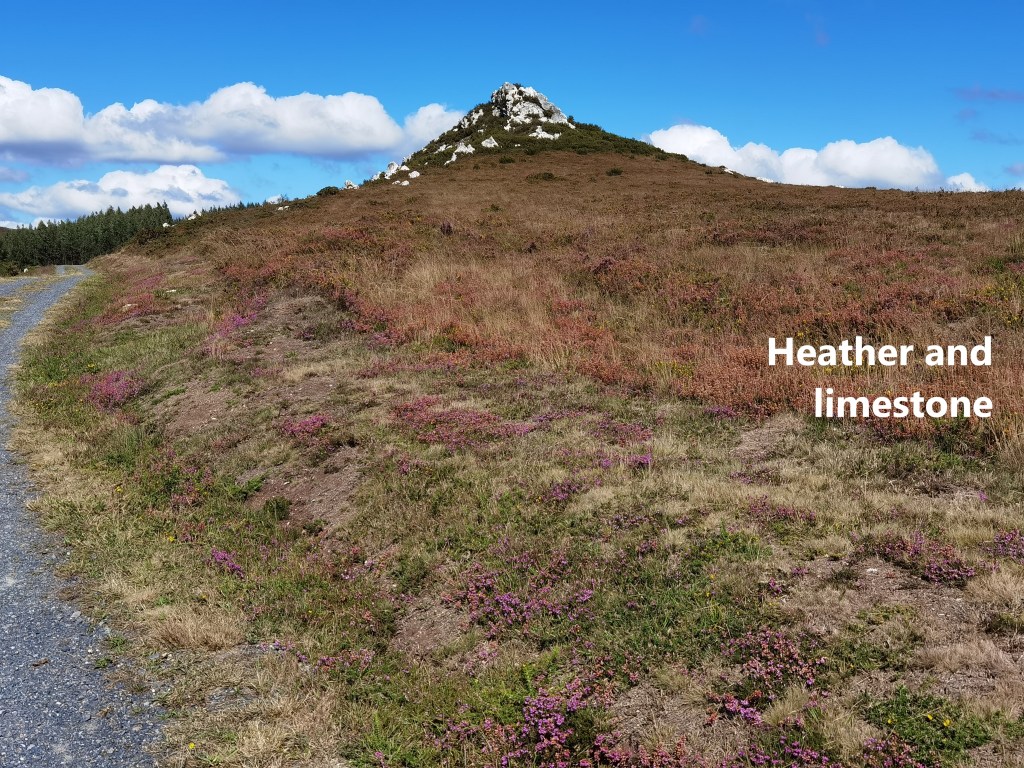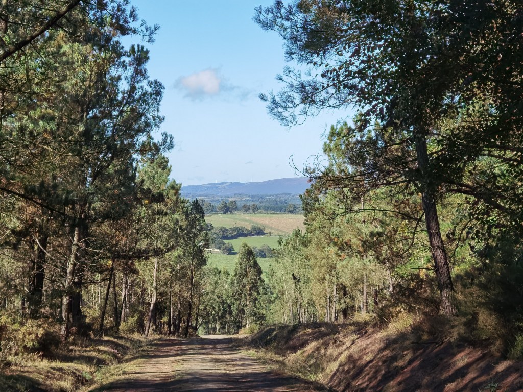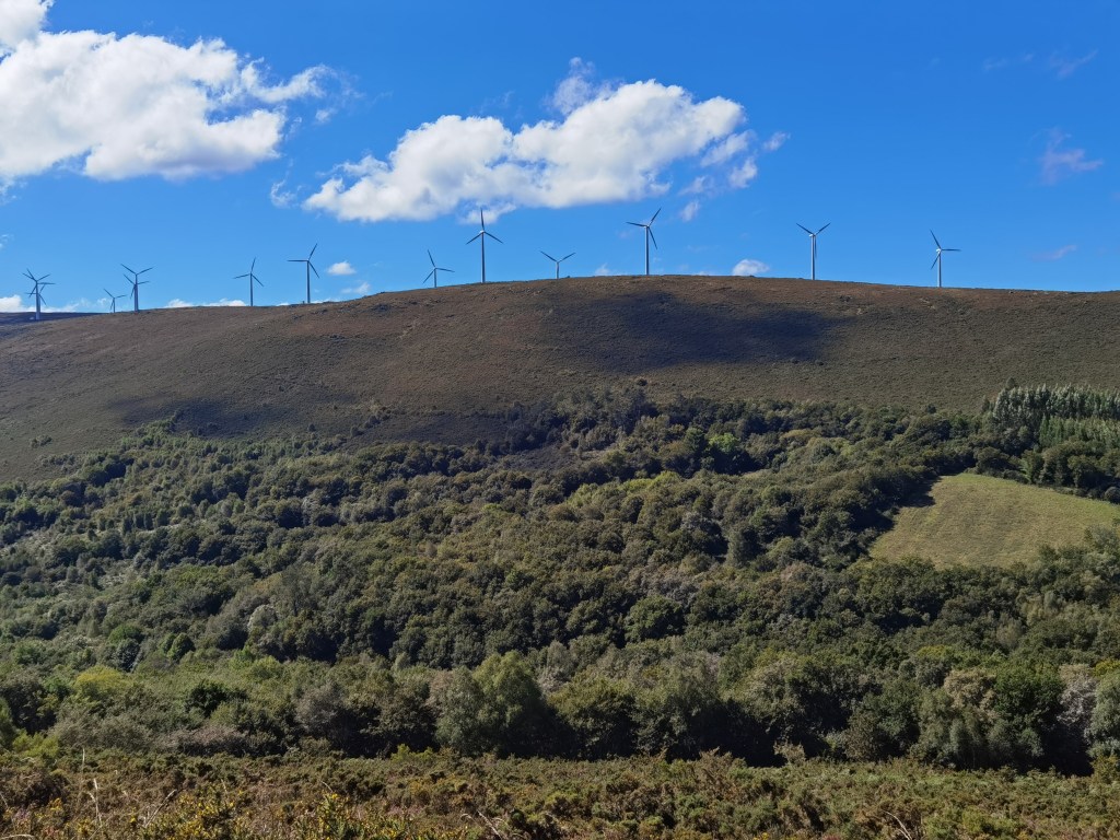 After As Seixas, the route climbs again. There is one more real hill before coming to the plain for the final days. The route goes through the forest and out onto open hillside. The heather and limestone were reminiscent of the best of west of Ireland walks. Across the valley, the ridge on the other side held a line of wind turbines.