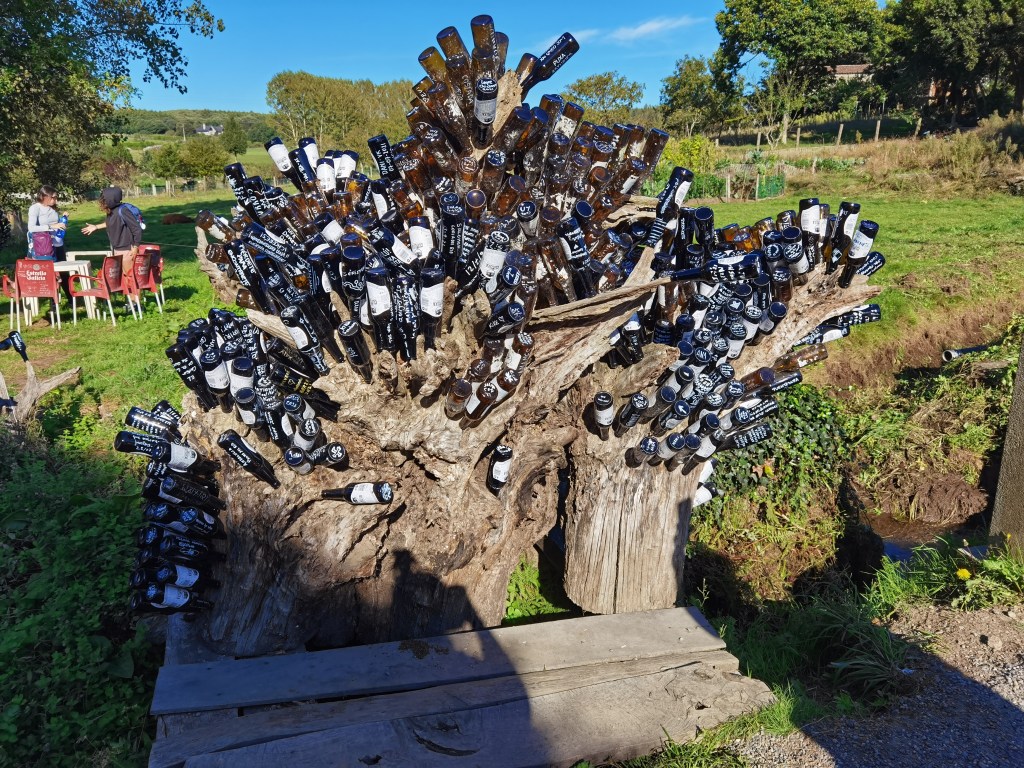 In A Calzada, I came across a bar that did not so much recycle old bottles, as turn them into “art”. Sometimes I wonder about people, but in any case, this bar had mounted hundreds of bottles on trees and shrubs around the bar. I don’t stop at such places, but went quickly on.