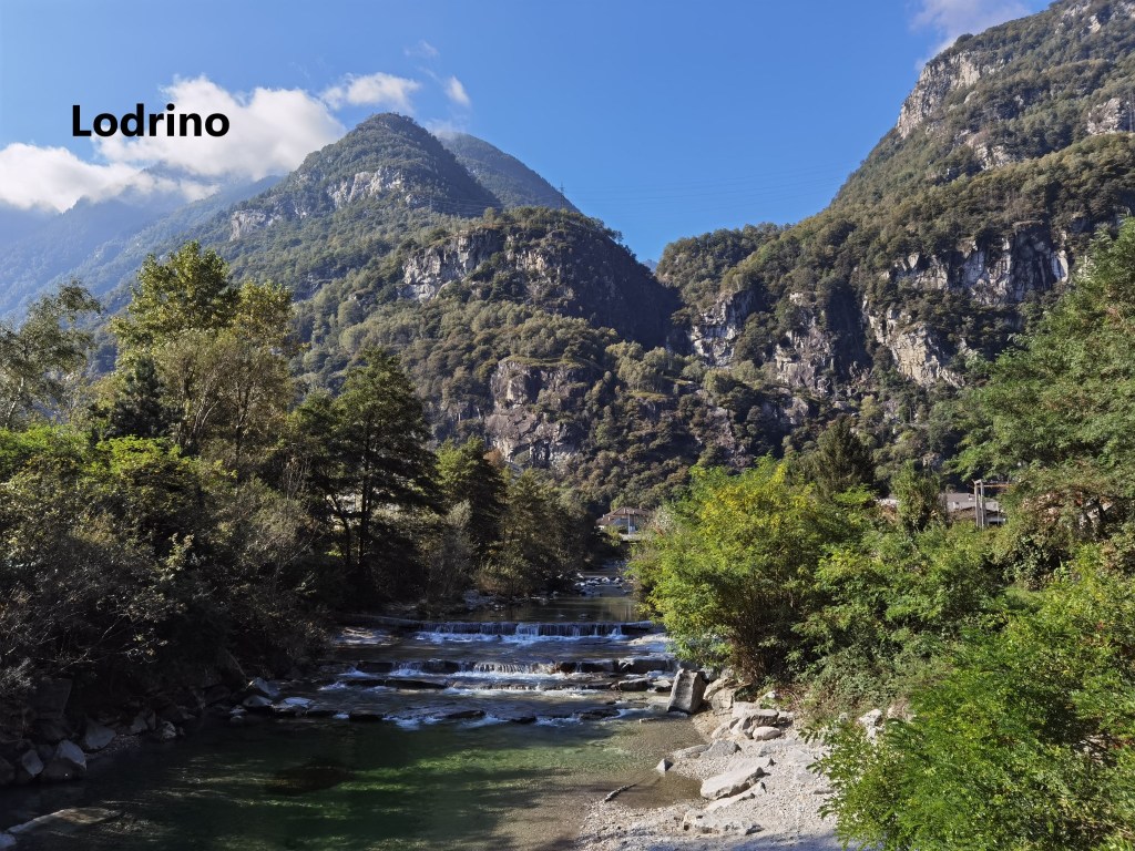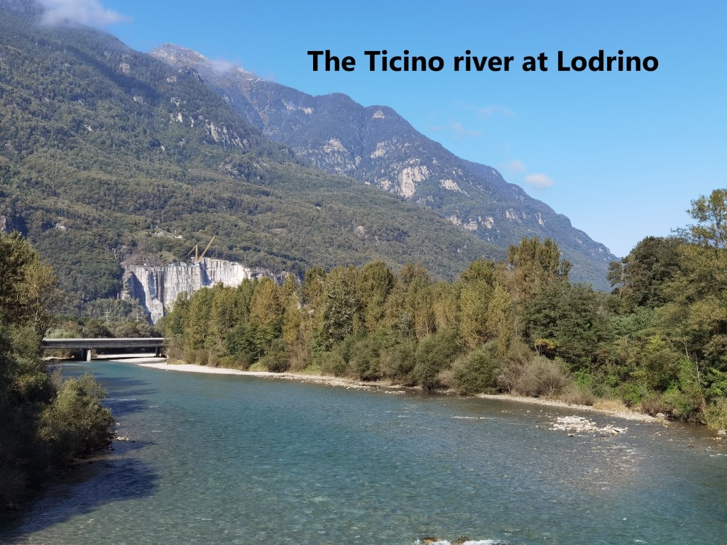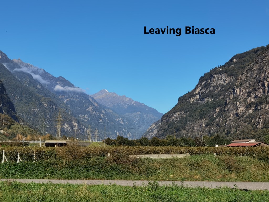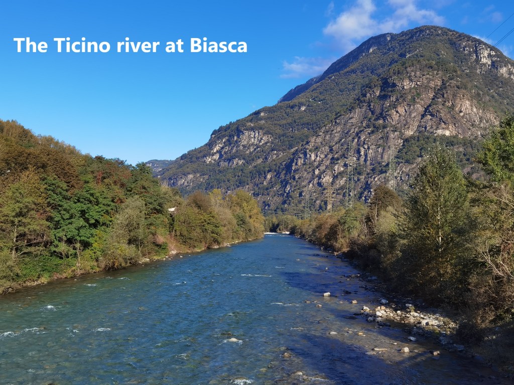 The weather has been kind this autumn, and I left Biasca with the sun in an almost clear blue sky, the last of the mists rising from the mountains around. As I left the town, heading back towards the Ticino river, there were clear views of the valley to the north, and the mountains I had come over in the last few months.
