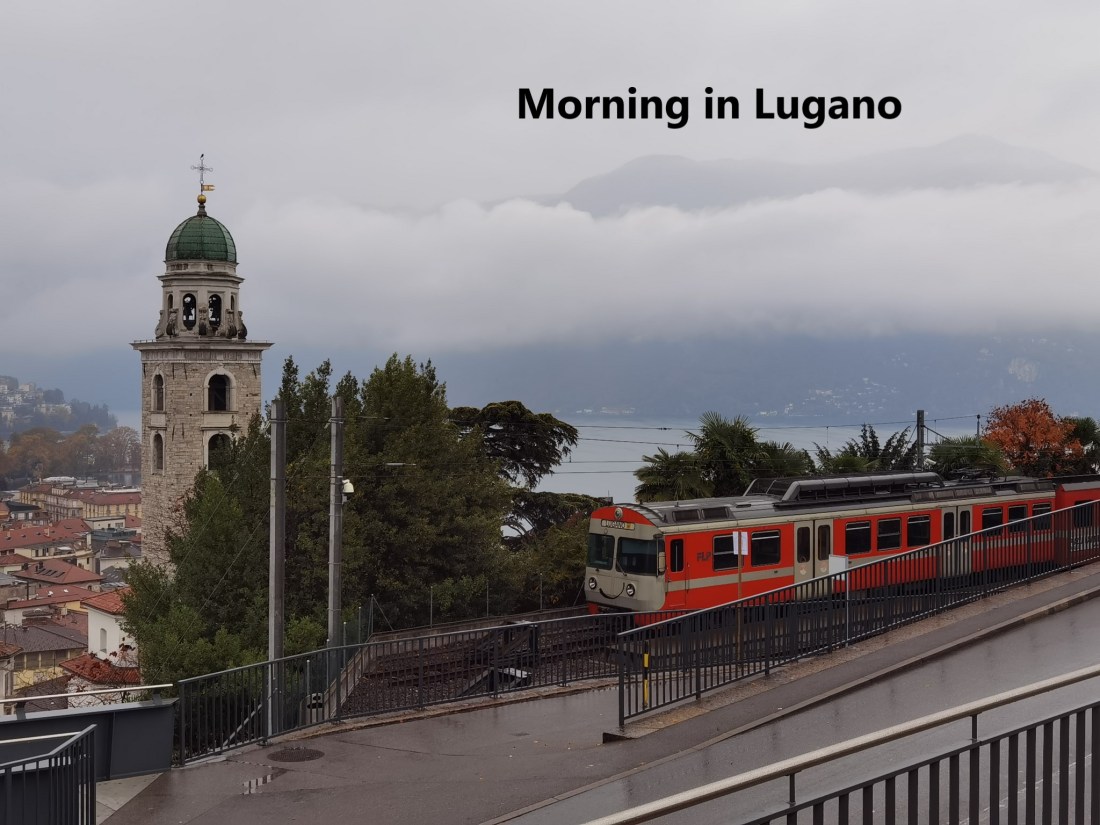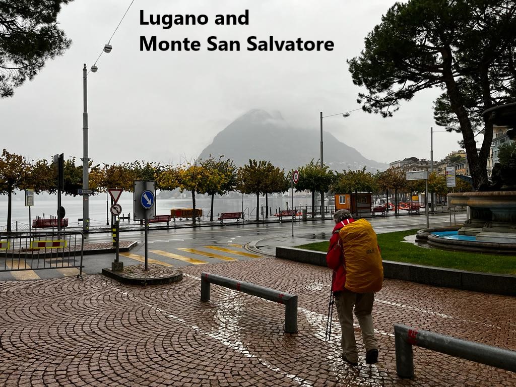 We started early in the morning, Matthias and I. The clocks had gone back from summer time to winter time during the night, and we used the extra hour to get on our way at eight o’clock. It was a damp morning, with rain, not so much falling, as simply condensing out of the air. Our first task was to find the trail. As we noted the day before, the waymarking did not run through Lugano. Coming into the city, the waymarks stopped at the suburb of Comano. Now, as we left the city, we would have to get to the Paradiso district to pick up the waymarks again. That meant a short walk along the lakeside promenade.