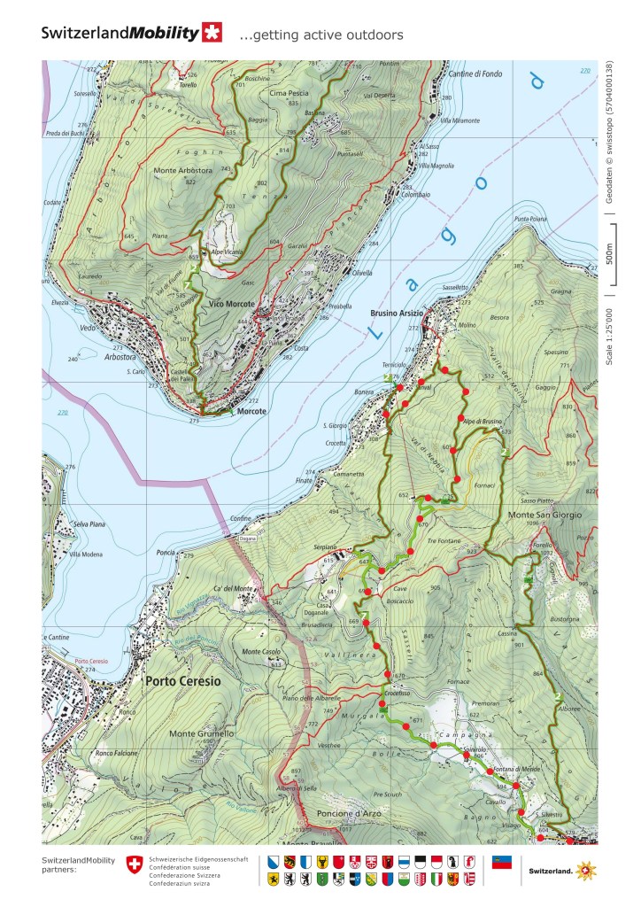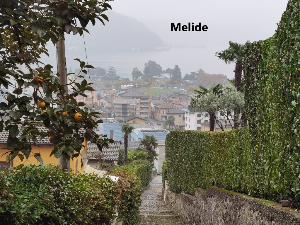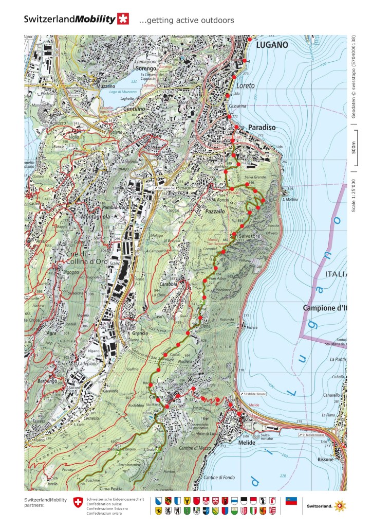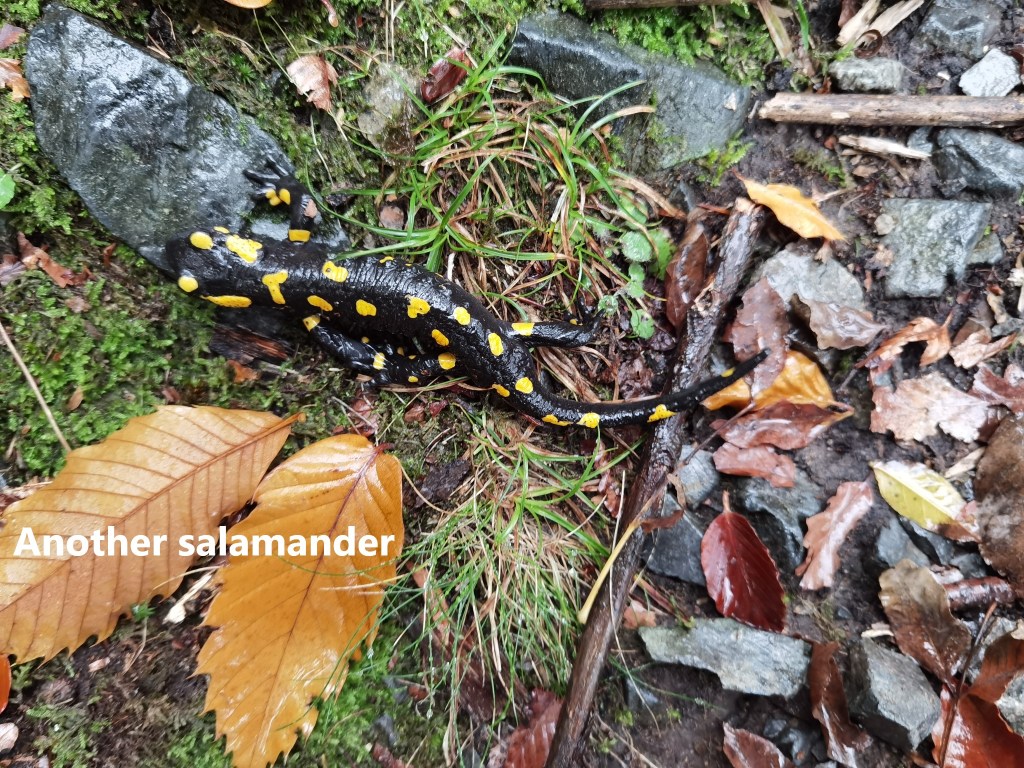 In Carona, we had a decision to make. The guide for the Trans Swiss Trail has the route going south from Carona to reach the lake shore at Morcote. The guide treats the distance from Lugano to Morcote as one stage, and from Morcote to Mendrisio as a second stage. Between those two stages, one has to cross the lake. But we had set out to do the two stages in one. For us, this presented logistical difficulties in that there were no boats running during the day, and we would have to get a busses and a train for a lengthy journey to bring us around the shore. And the times of those busses and trains also presented difficulties. For these reasons, instead of continuing on from Carona to Morcote, we decided to go to the lake shore at Melide, and take the transport around to the other side of the lake from there. As if to validate that decision, we came across another salamander on the way down. They are visible when on the trail, though once among the leaves on the forest floor, I expect that their mottled colours make them harder to see.