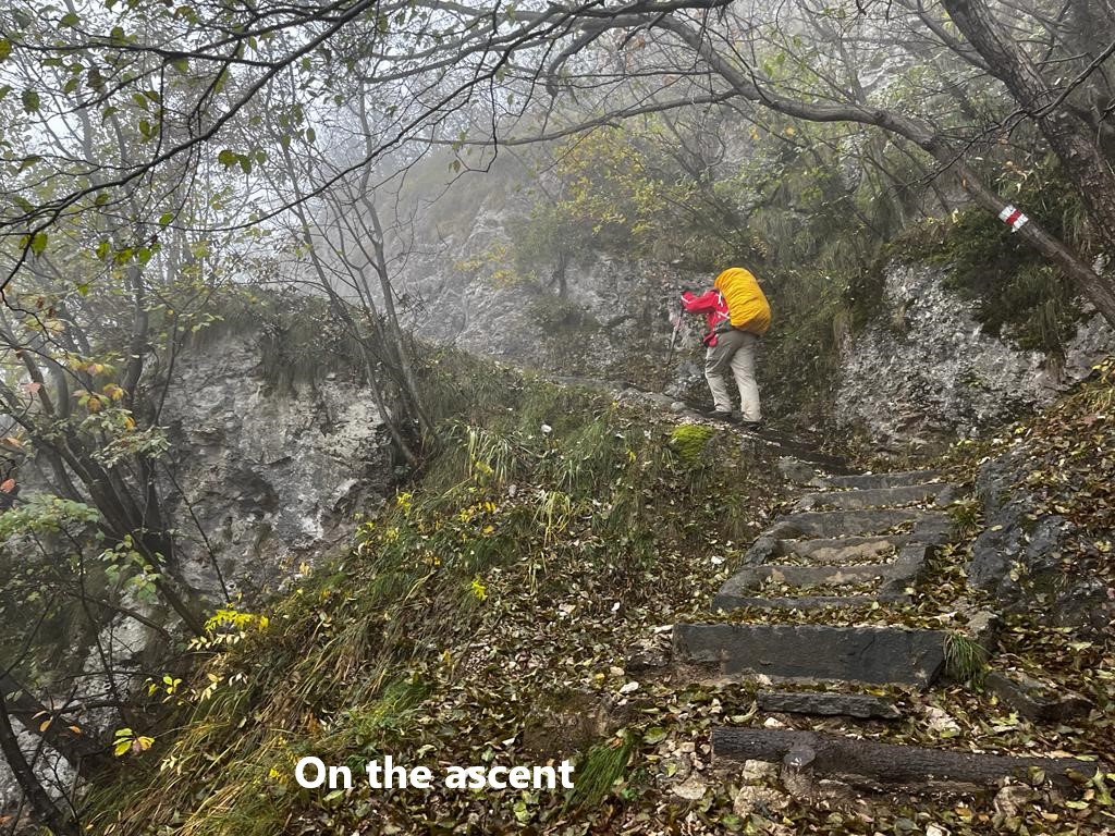 Once we reached the Paradiso district, we left the lake shore, and we were soon into the ascent. There is a funicular railway that runs to the summit of Monte San Salvatore, but even if we had wanted to use it, it looked like it had stopped running for winter. Instead, we followed a track initially, curving around and upwards. Then our route ran beside the funicular railway for a short while, before returning to a forest track that zig-zagged upwards through the trees. It is a steep ascent. There were viewing points, that on a good day, I am sure would have provided magnificent vistas over the lake, but we were into the clouds, so there was nothing to see except the grey mist all around.