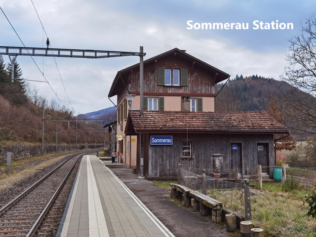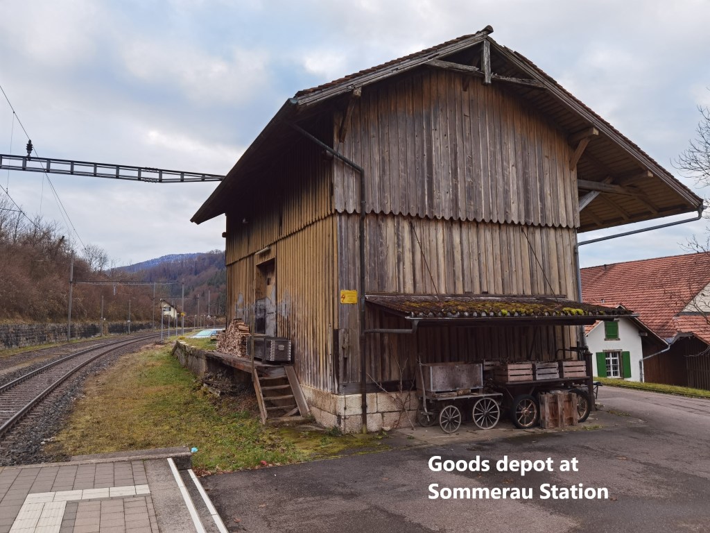 For many years, Sommerau and Läufelfingen were the only permanent stations in this valley. It is somewhat incongruous, as Sommerau itself is not even a village. It is best described as a farming settlement. Other villages on the line did not get stations until well into the twentieth century. That is why Sommerau station, despite being almost in the middle of nowhere, has a permanent brick built station building. The nearby goods shed is of wooden construction and looks like it was abandoned sometime about 1950. Today, the station building is actually home to a medical massage business. The ticket office and waiting rooms have long since ceased to function.