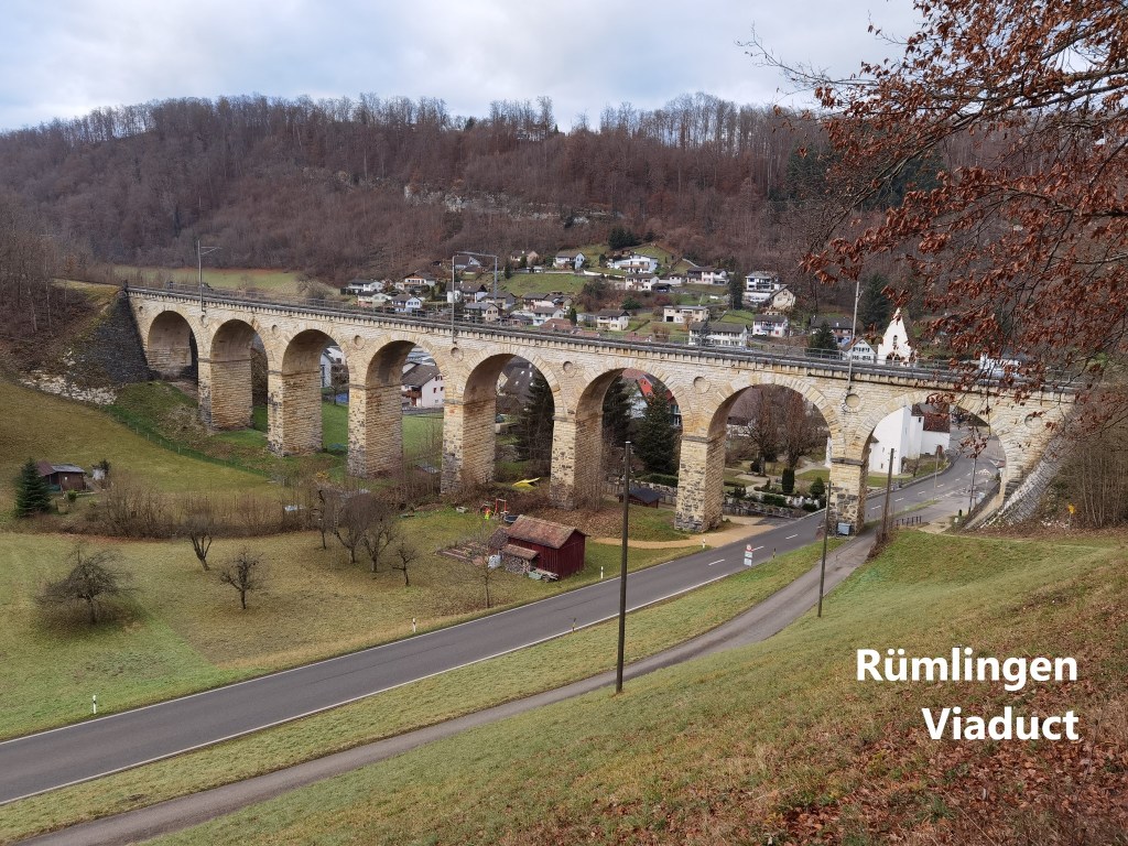 Following the trail, I turned left at Rümlingen, going uphill a little, but stopping just short of the woods to get the best view of the Rümlingen viaduct. This feat of engineering was built between 1856 and 1858. It was unusual at the time to build viaducts of stone. Iron construction was cheaper, but stone lasts longer. The engineer leading the construction of the line, Karl von Etzel, is reported to have taken inspiration from similar viaducts in Austria. It is 128m long and 25m above the valley floor. Whereas the iron viaducts have almost all been replaced with stone in the twentieth century, the Rümlingen viaduct remains. It is the oldest viaduct in Switzerland still in its original state. With a history like that, I just had to check the train timetable, and I was delighted to find that if I waited just four minutes, I would see a train go across.