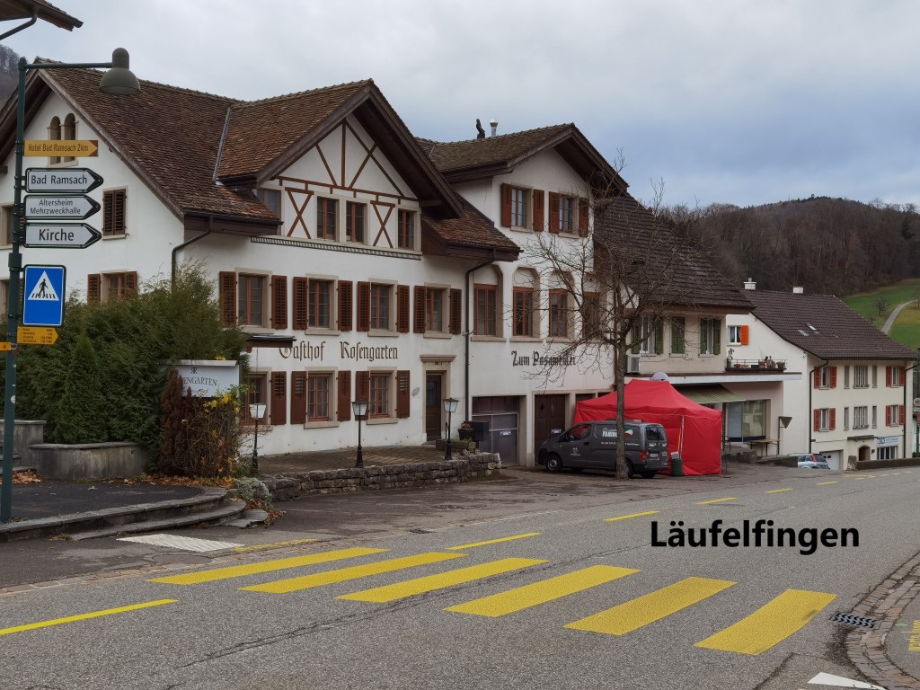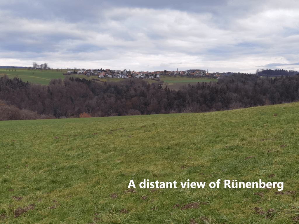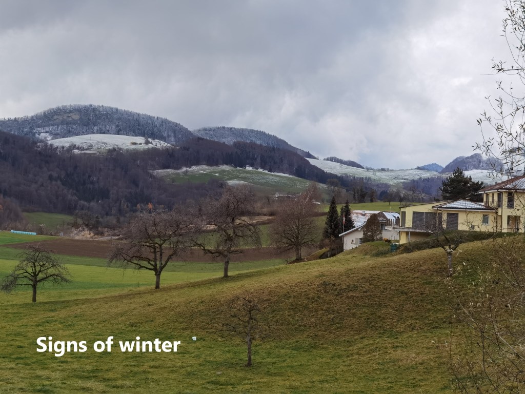 I left Rümlingen, going up into the hills to the east. Soon I was walking through upland farm country. Across the fields, I could see the village of Rünenberg. Here and there, isolated trees have adopted their winter skeletal form. In some of the distant higher spots, I could see a light frosting of snow. It is indeed winter now.