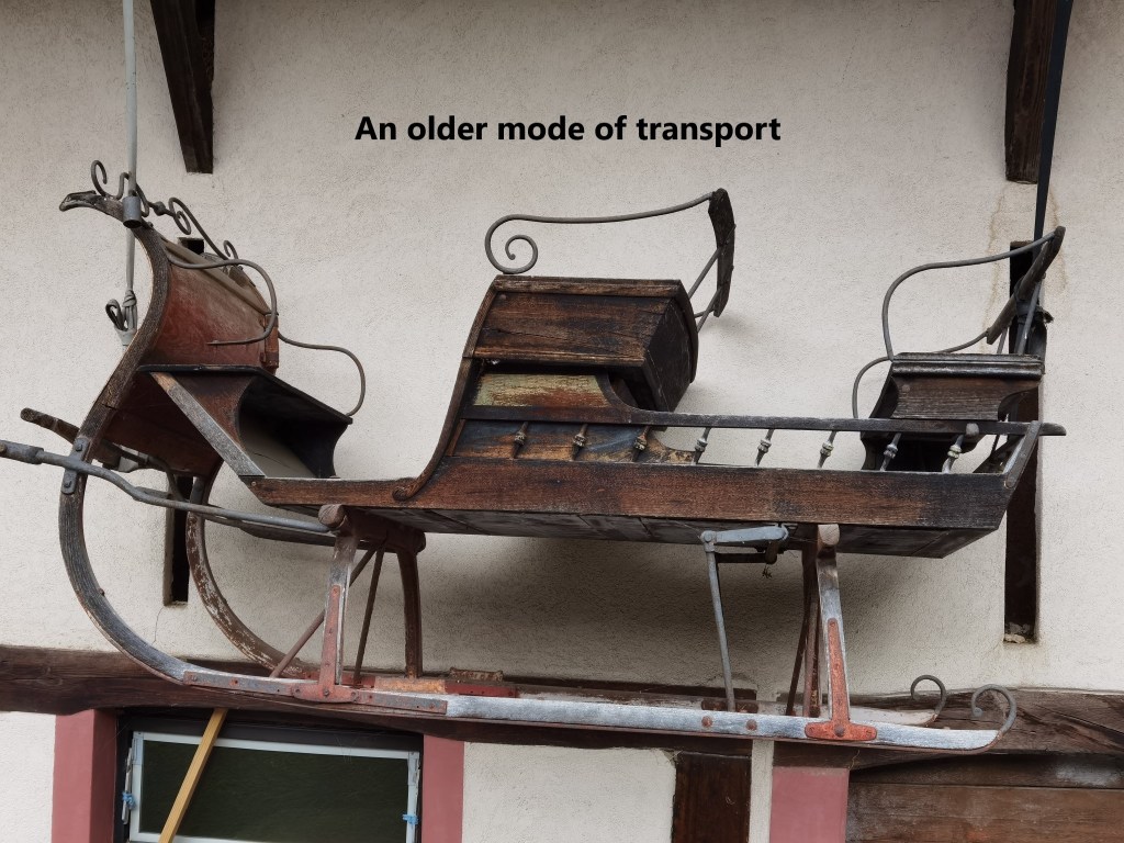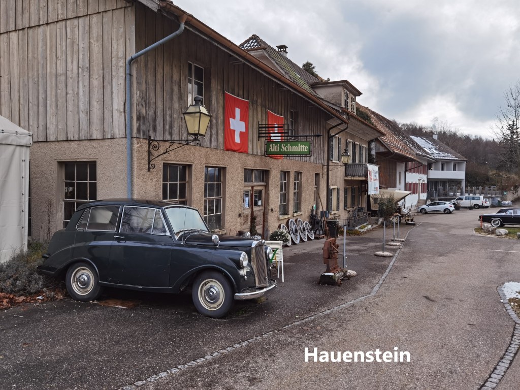 The pass is also the point where I left Basel Landschaft canton behind and moved into Solothurn. Once over the pass, it was downhill again to the village of Hauenstein. I went through Hauenstein before when I was walking the Jura Höhenweg. There is a restaurant in the village, the Ate Schmitte, but it seems that every time that I come to Hauenstein it is closed. Last time, I was too early for its opening season, and this time too late. A sign said that it would be closed for winter from 1st November. But even when closed, the Alti Schmitte has an interesting array of classic cars outside in various stages of disrepair.