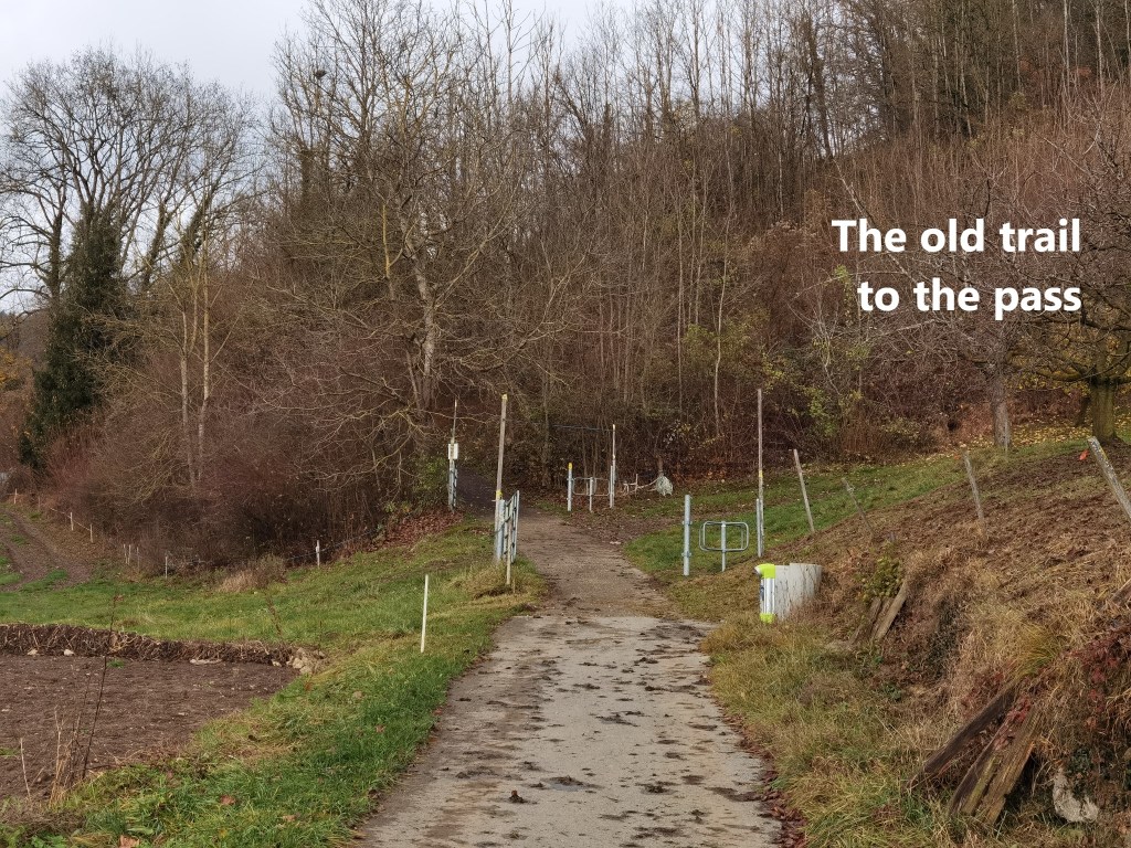 From Hauenstein, I went on downhill. Away to the west, I could again see a light frosting of snow on the hills. And then I came to the Felsdurchbruch. At first, this looks like a natural cleft in the rock, but it is not. People having been using the Hauenstein Pass as a route through the Jura Mountains for centuries. At that time, it must have been no more than a mule track. In the 1560s, as part of improvements to the track, the Felsdurchbruch was made. It has been there for over 450 years now, so it has become natural in appearance.