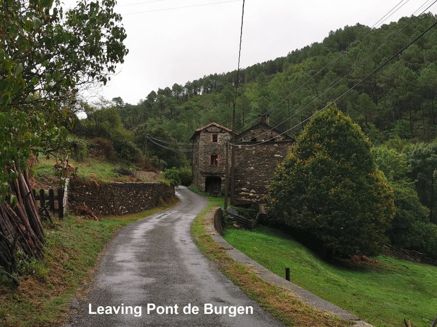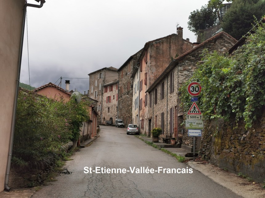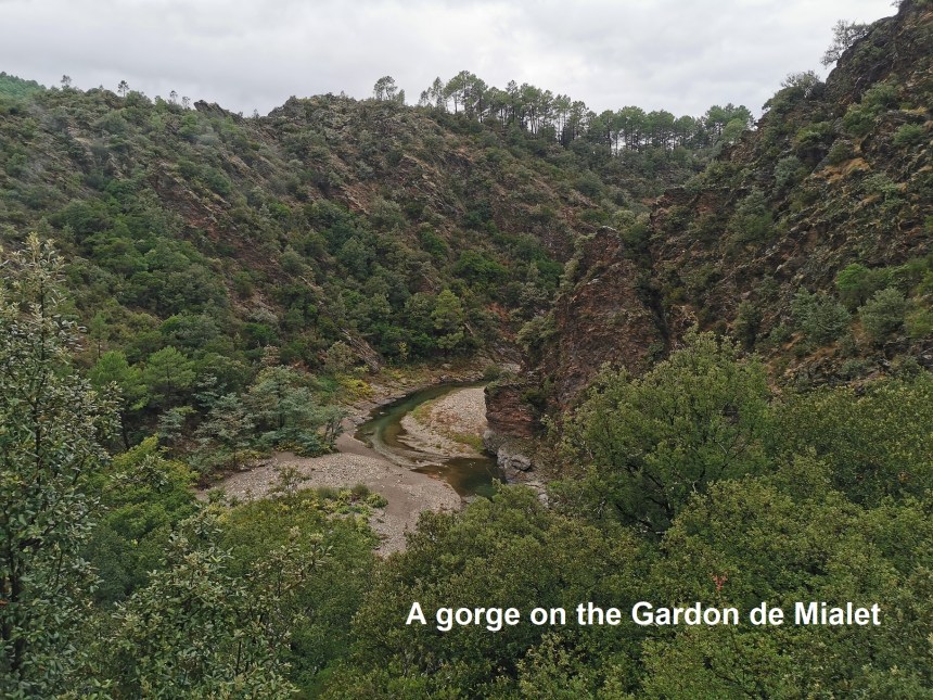 Of course, the weather gods were just playing with us, and we had only gone a few kilometres before the rain had stopped and it looked like it was finished for the day. The skies were still grey, but lighter than before. So after those few kilometres, it was possible to take off the raingear. It had done its work at that stage and had justified its inclusion in the backpack. The road follows the valley of the river Gardon de Mialet. This is a country of gorges among the hills, and the river had cut deep into the rocks of the valley. St. Etienne is in the department of Lozère, and that department takes good care with its roads. There were kilometre markers along the road, and we could count the distance as we went.