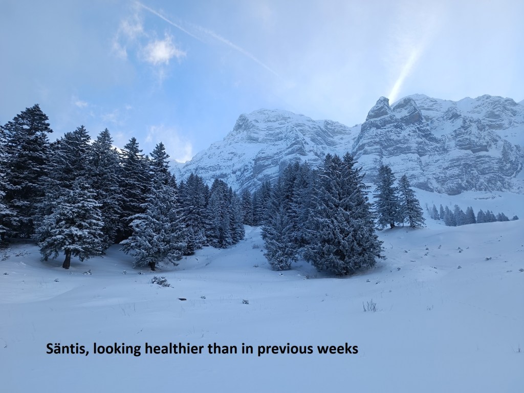Within less than a hundred metres, I was into deep snow. I seem to have a habit of underestimating the snow. I bemoan its absence when it is not there, and underestimate its depth when it is. But at least Säntis was looking better than on my previous outings.