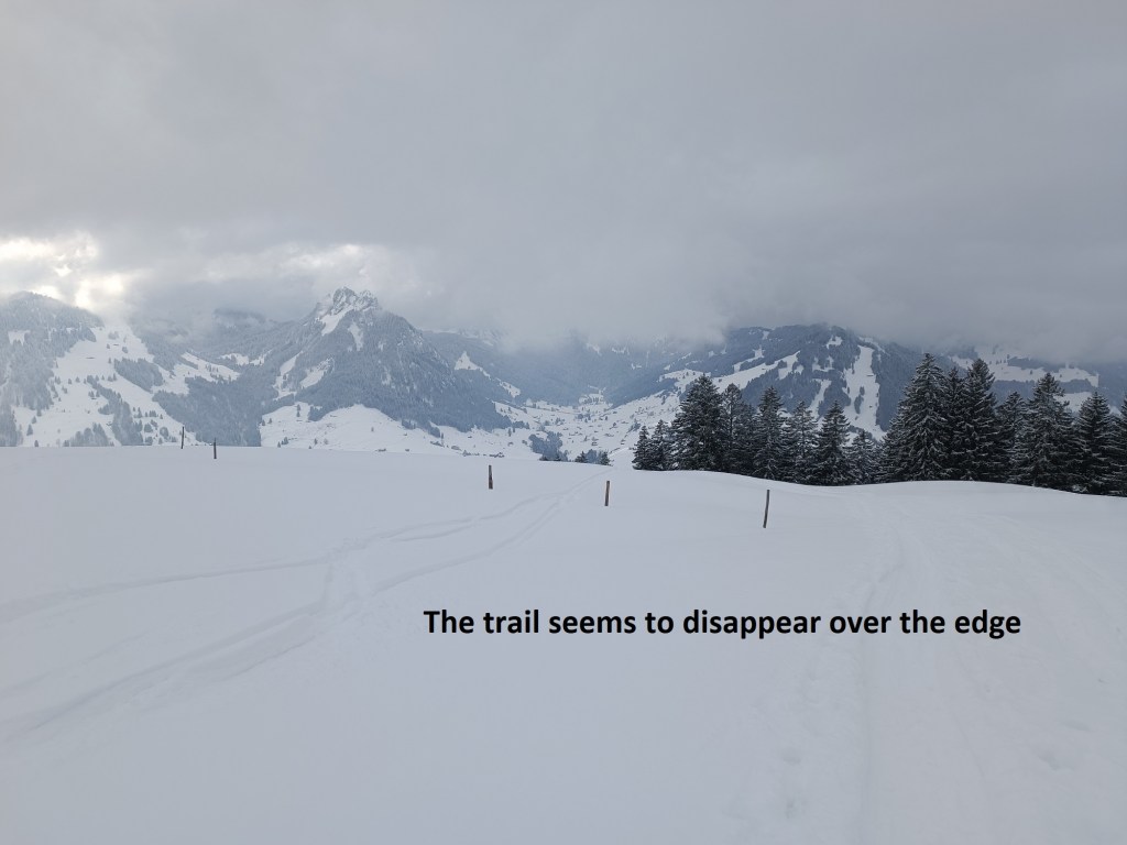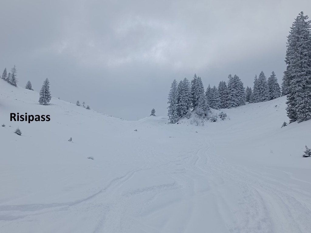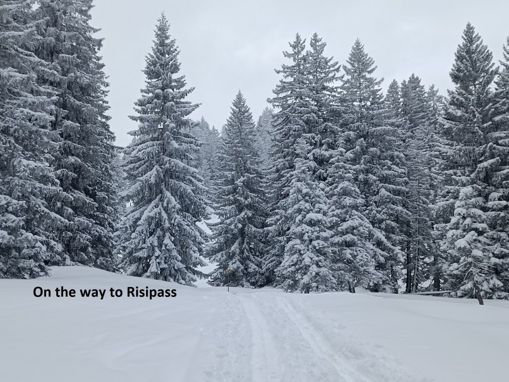 It was mostly downhill to Lutertannen, but the trail turns sharply left at that point, and starts uphill again. It was steep at first, twisting and turning to gain height, but then becomes more gradual on the way to the Risipass. I had met no one between Schwägalp and Lutertannen, but between there and the Risipass, I met plenty of people. The problem with that, though, is that on the flatter ground, the snow seemed deeper, or maybe it was just a feature of the higher ground.