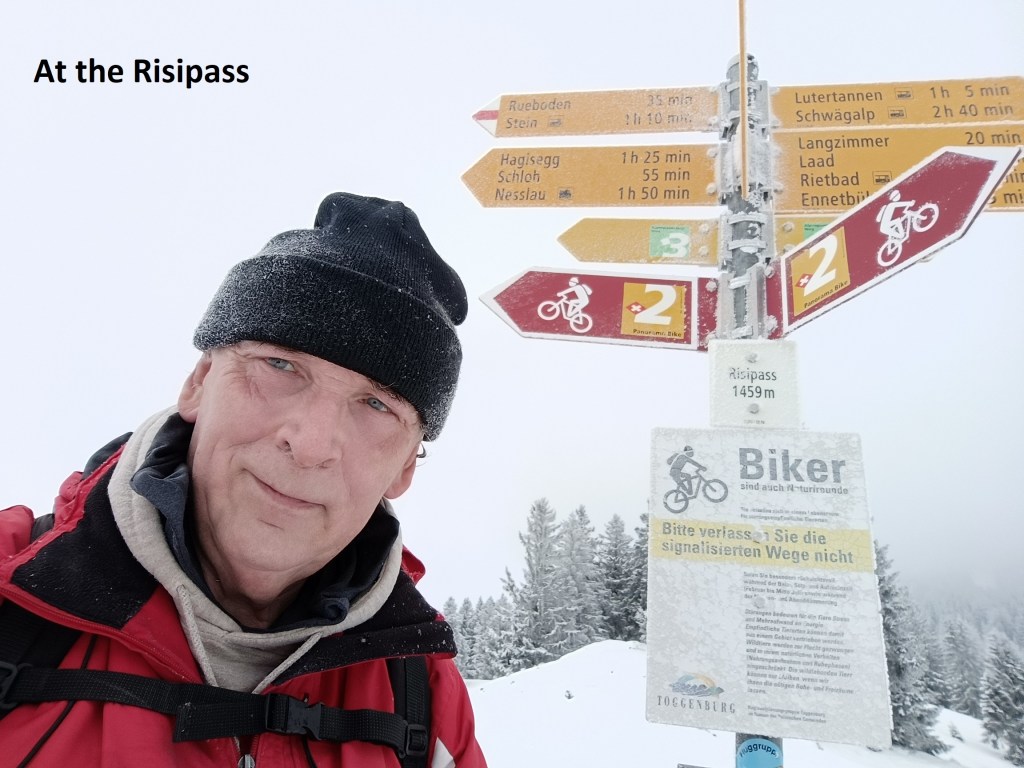 I fell twice in the snow. People often think that snow is slippery, but in general, it is not. Mostly, my feet would sink until I hit something solid and then grip. But on one occasion, I did slip, and found myself falling sideways into the flat snow. On the second occasion, my foot went through a snow cornice, and I pitched forward, again onto flat snow. But these were just minor setbacks, and I kept going, onwards and upwards, towards the pass. Eventually, the Risipass itself came into view. This marks the boundary between Appenzellerland and St. Gallen cantons. I paused for just long enough to take a selfie at the top of the pass. On another day, I might have gone to the nearby Stockberg, but with slow going through the snow, I decided to keep going.